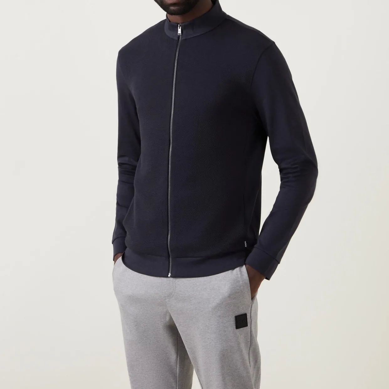 - Long sleeves, stand-up collar, zip-through fastening, slit pockets, logo tag, textured finish