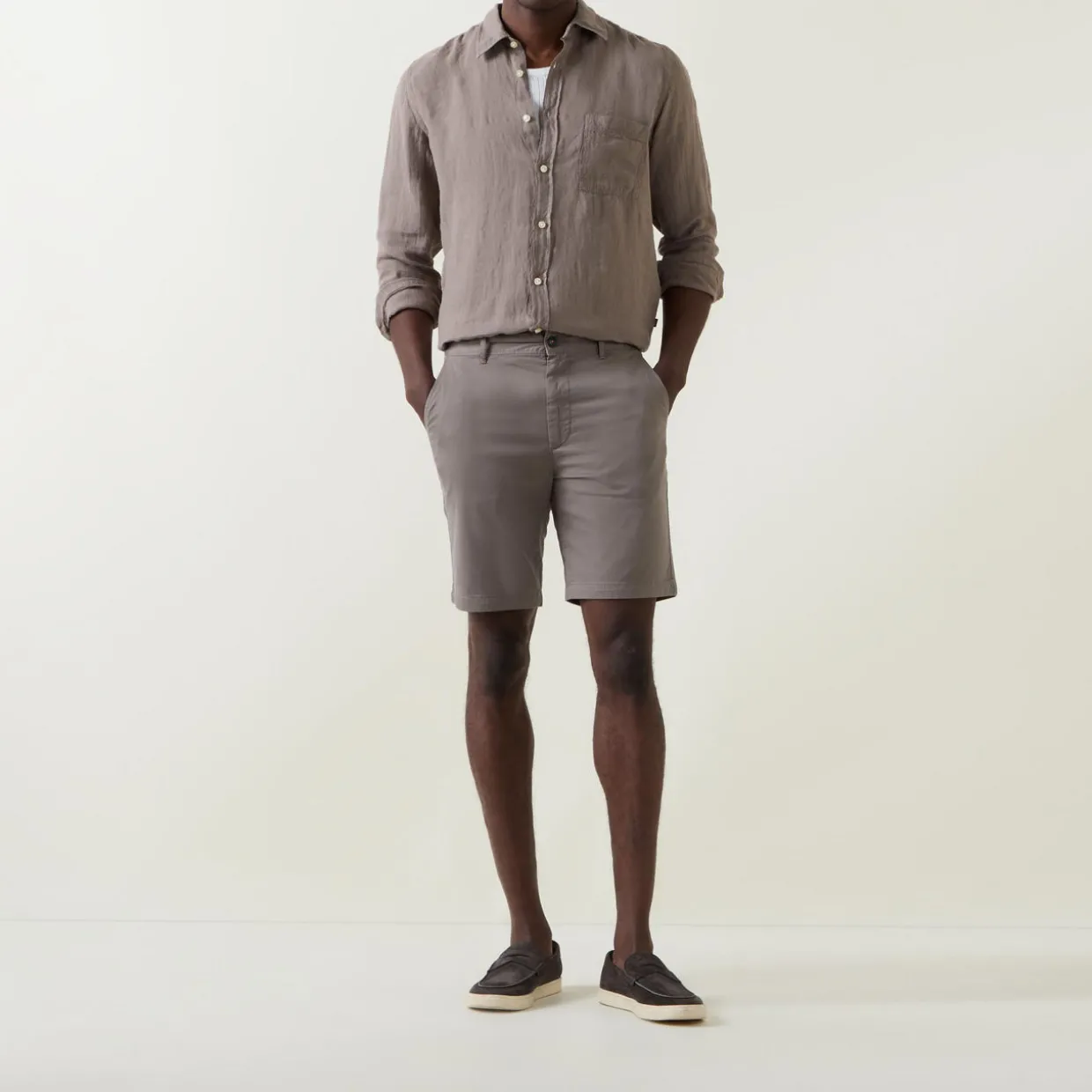 - Mid-rise, slim leg, above the knee length, belt loops, concealed zip fly and button fastening, two side slit pockets, two rear welt pockets, clean hems, logo detail, overdyed finish