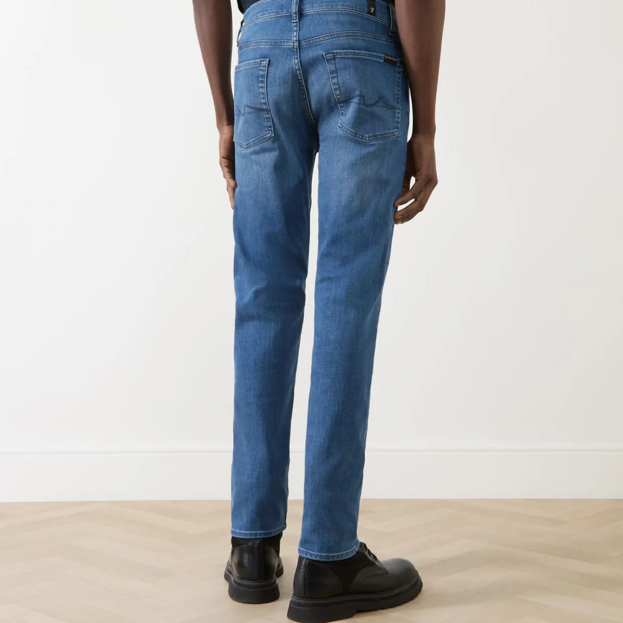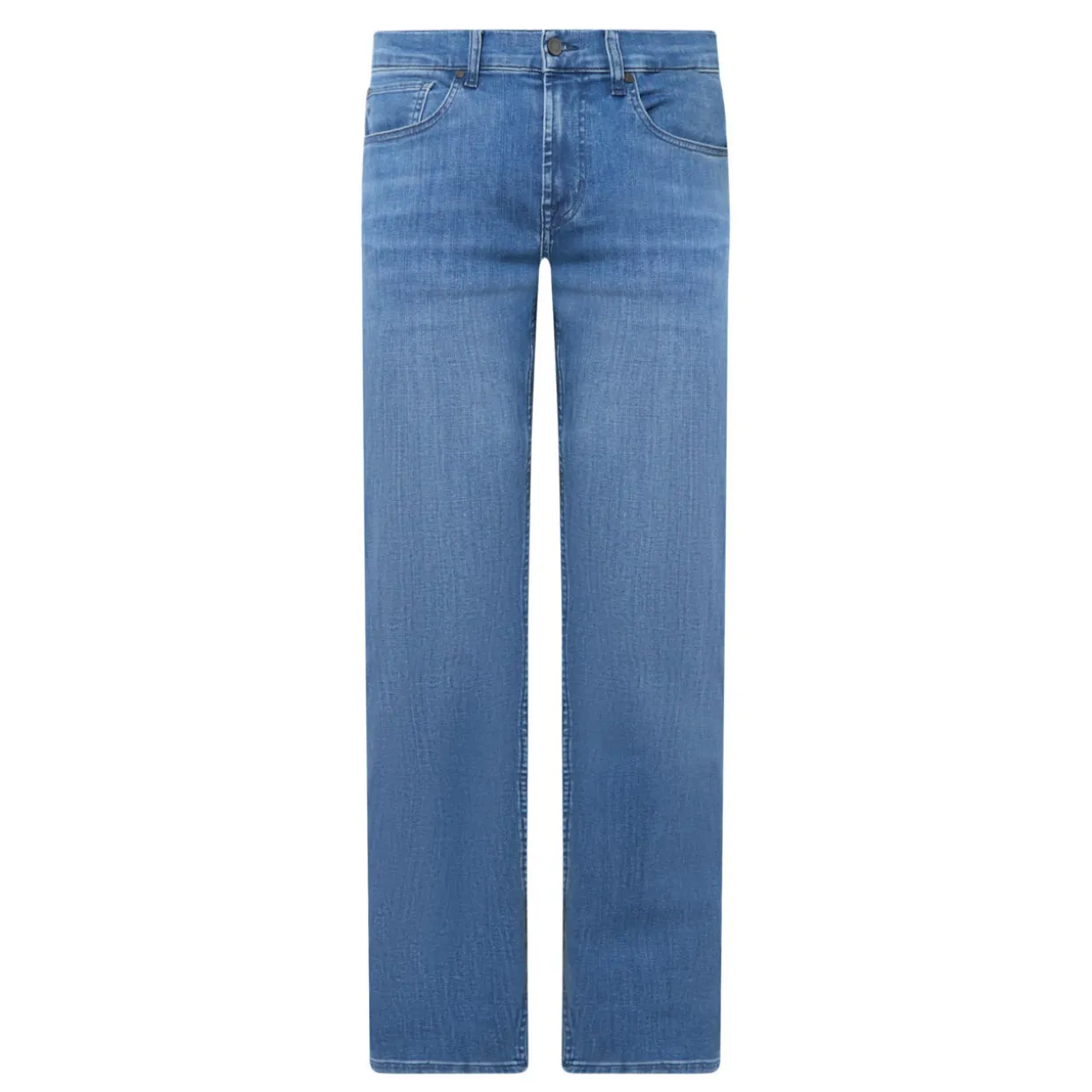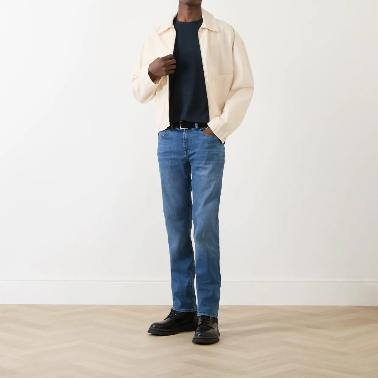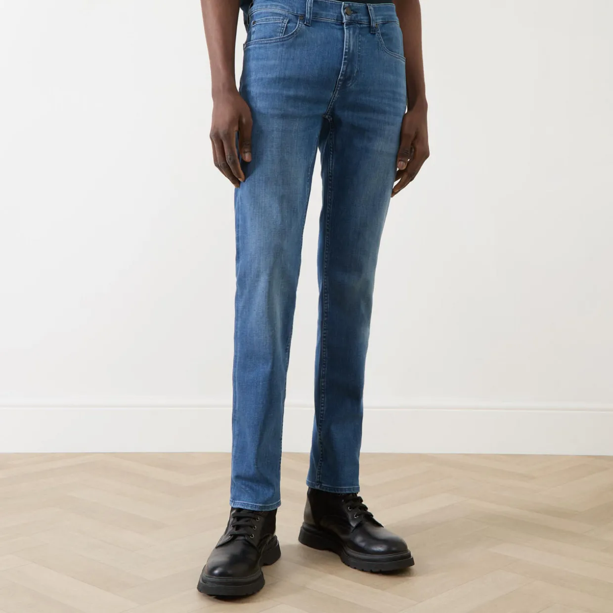 - Mid-rise, slim leg, belt loops, concealed fly and button fastening, five-pocket styling, clean hems, rear logo branding, mid wash finish, super stretch fabric, shape retention, soft finish