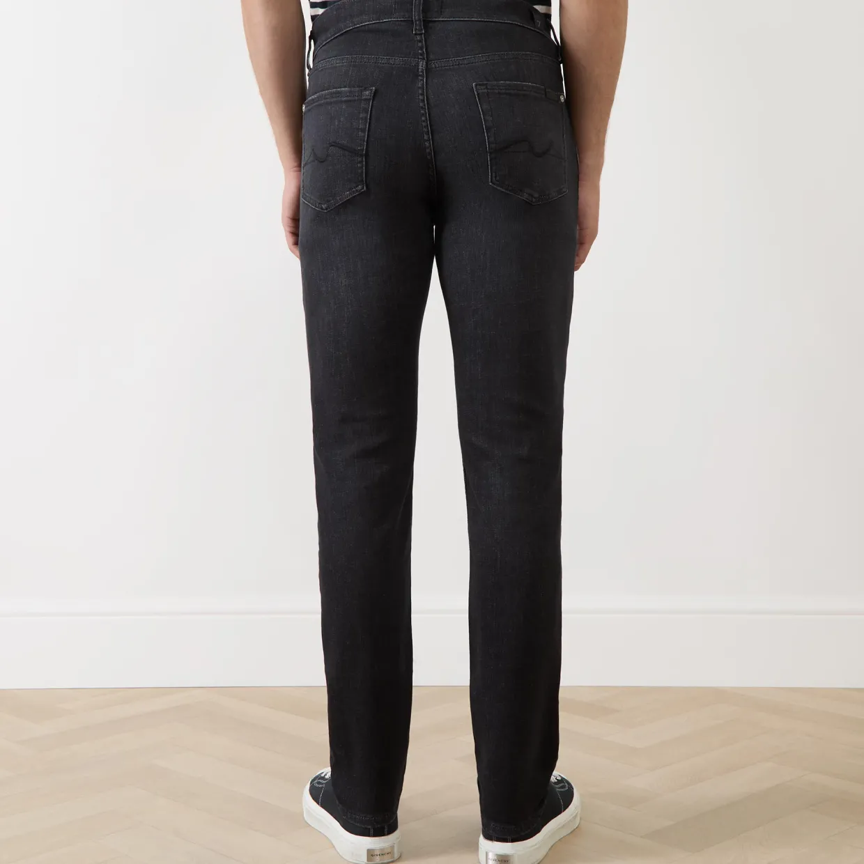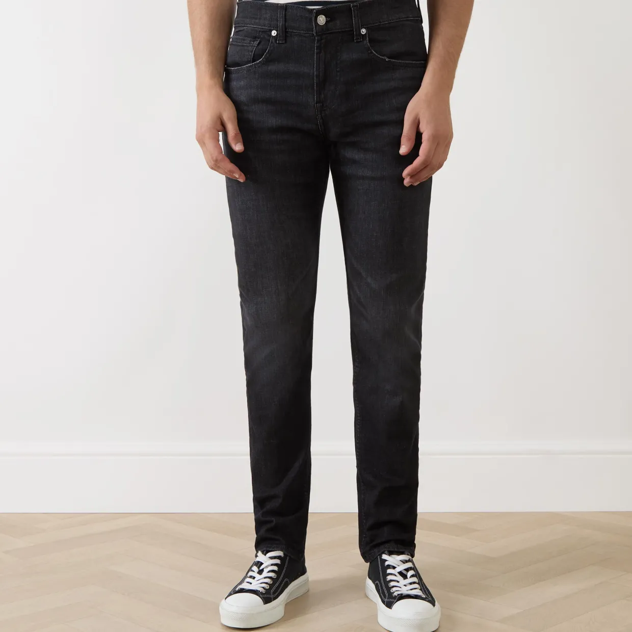 - Zip-fly and button fastening, belt loops, five-pocket design, tonal stitching, rear logo patch, mid-rise, tapered-cut leg, smooth denim finish