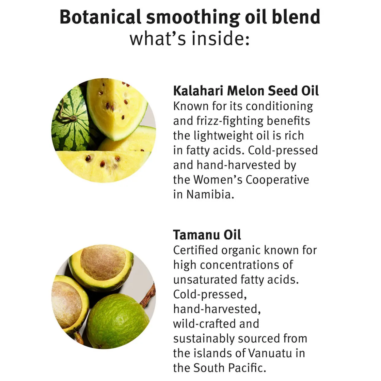 - Key Ingredients: Kalahari Melon Seed Oil Known for its conditioning and frizz fighting benefits, this lightweight oil is rich in fatty acids. Harvested and cold-pressed in Southern Africa. Tamanu Oil Certified organic and known for its smoothing benefits and high concentrations of fatty acids. Wild-crafted and cold-pressed on coasts of the South Pacific.