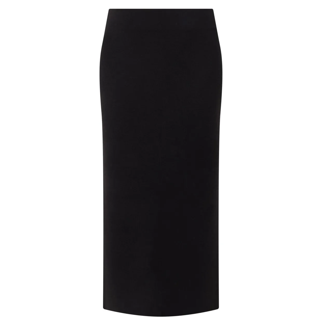 - Mid-rise, pencil silhouette, covered elasticated waistband, straight hem, side slit, midi length, smooth finish