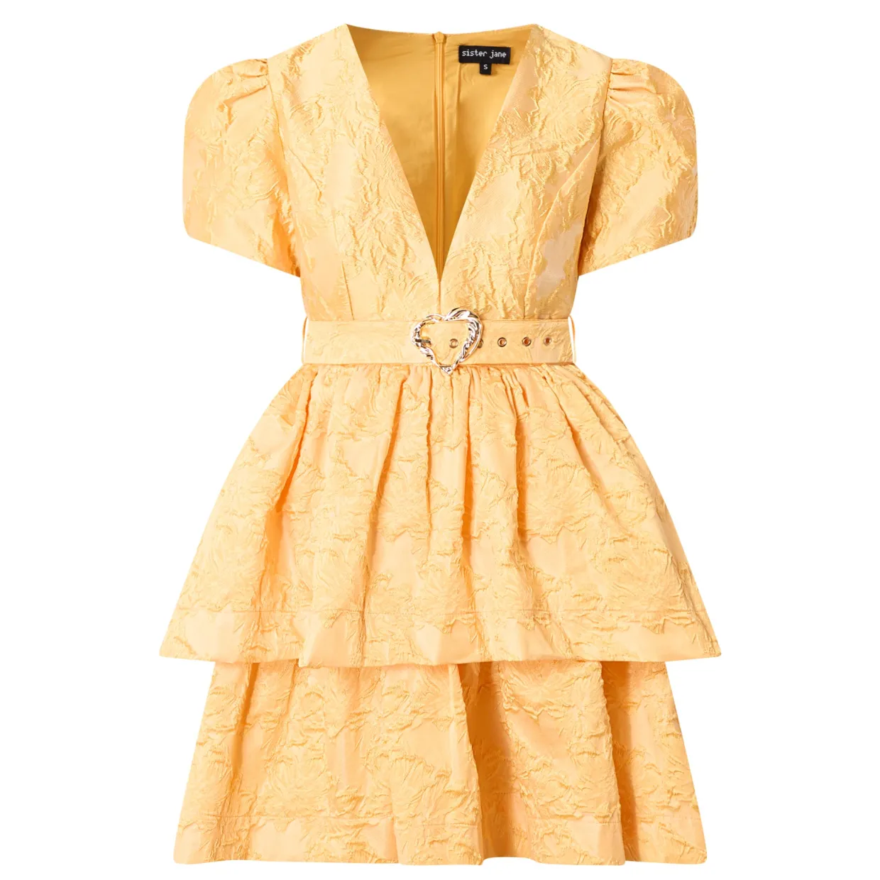 - Mini length, floral jacquard design, concealed hook and eye fastening, fully lined, matching belt, gold-toned hardware, V-neckline, short sleeves