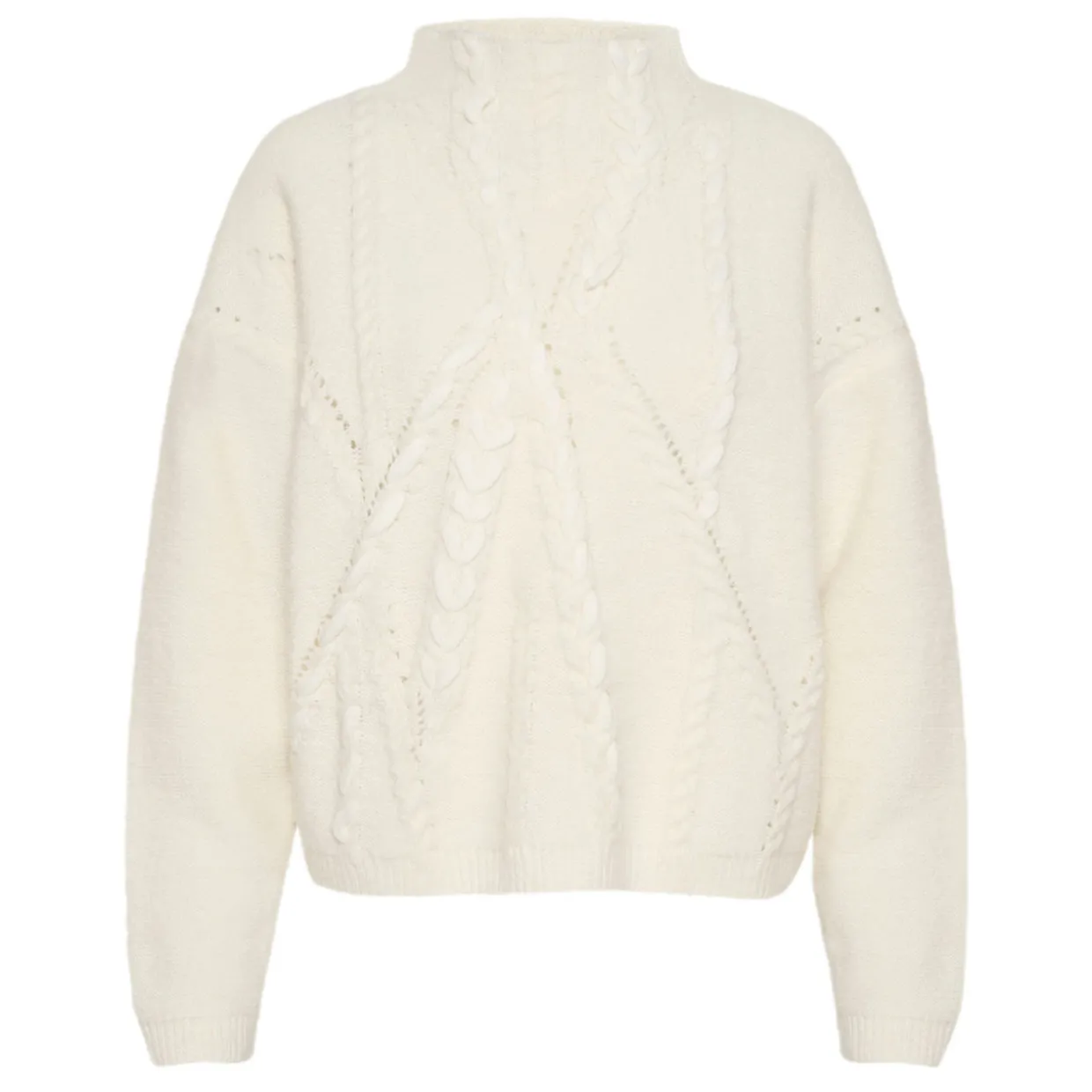- Mock neckline, long sleeves, dropped shoulders, ribbed trims, patterned design, knitted finish