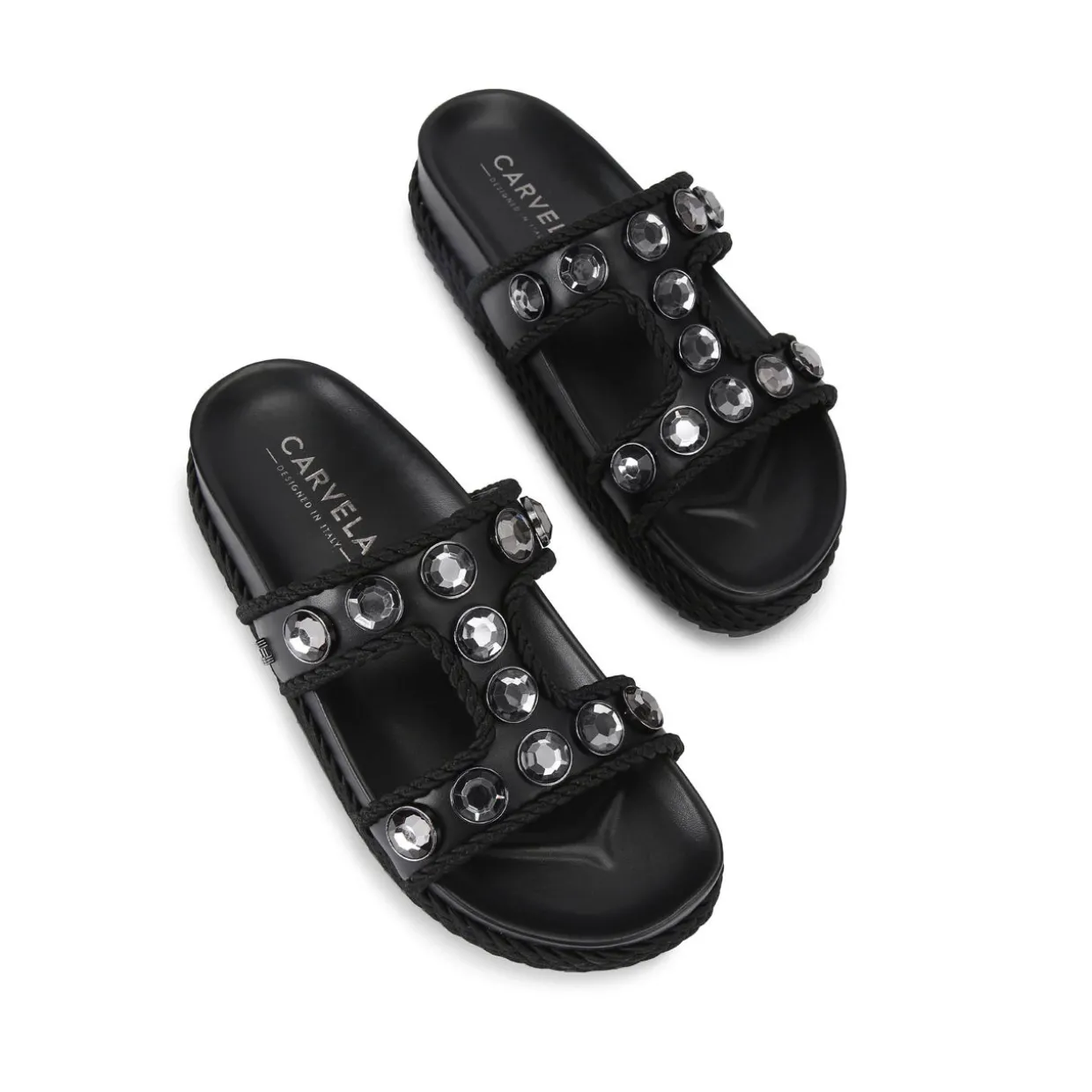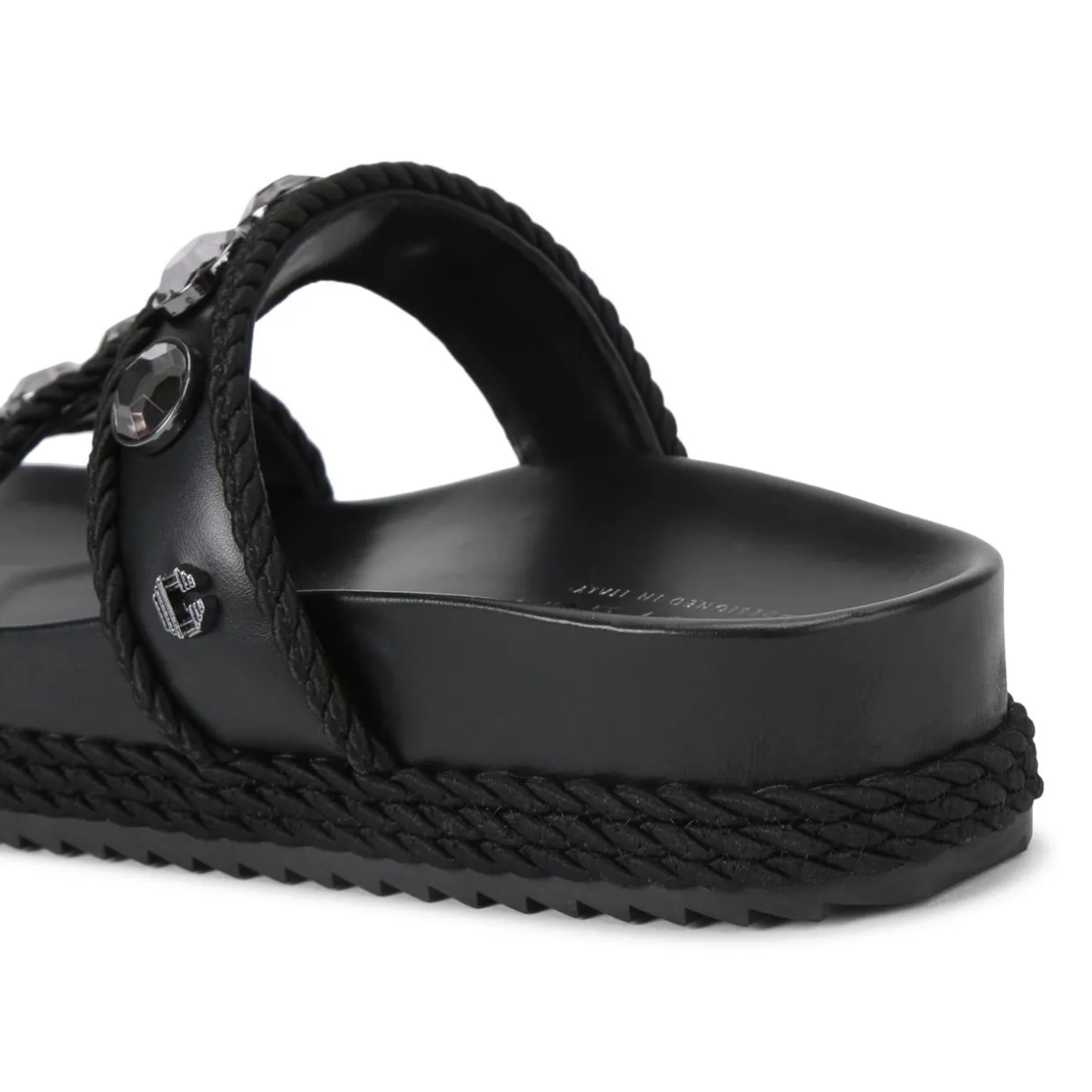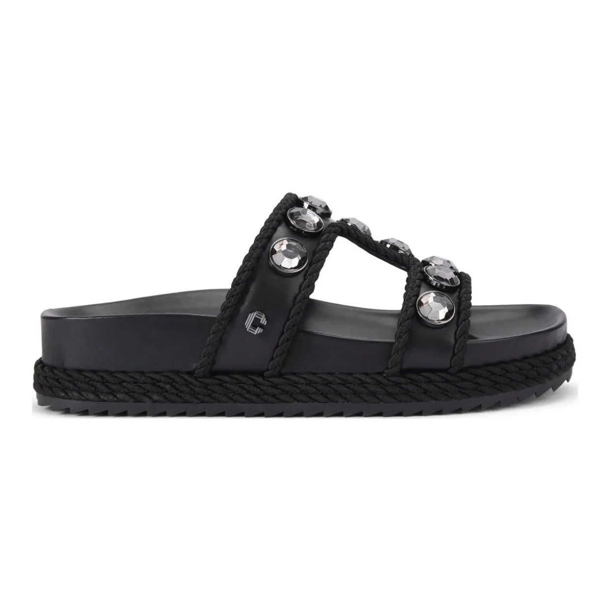 - Slip-on style, embellished with large black crystals, trimmed with a black rope, moulded sole for comfort