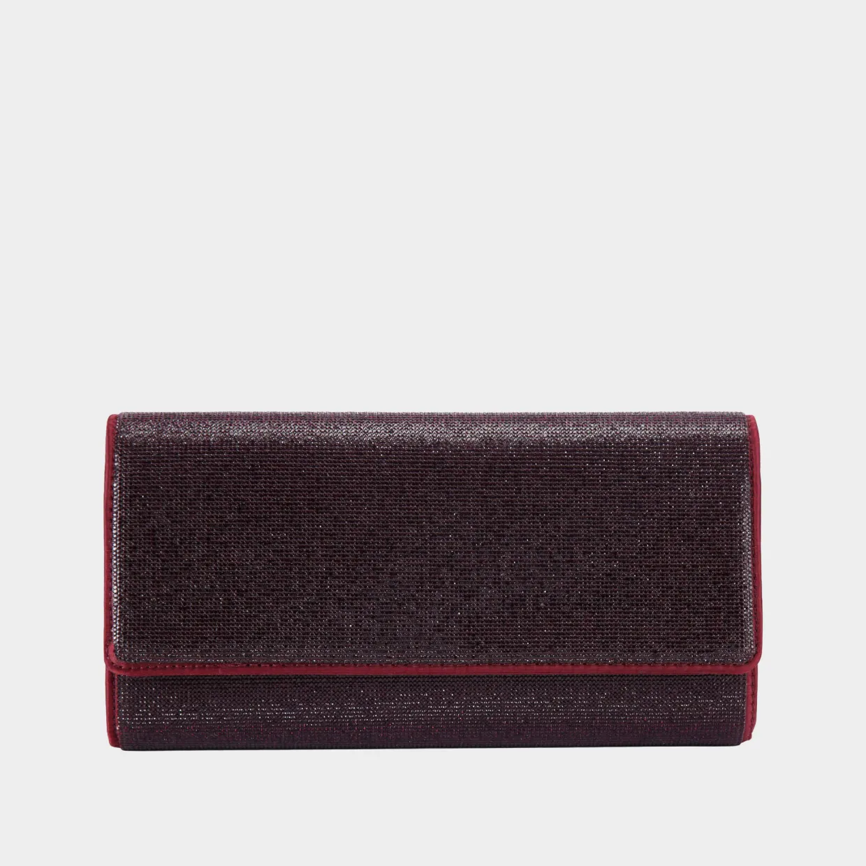 - Clutch silhouette, fabric design, chain strap, crystal embellishment, gold branding