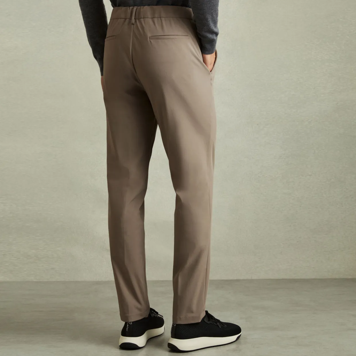 - Button and fly zipper fastening, elasticated waistband with drawstring adjustable fit, side entry pockets, jet pockets, belt loops, technical stretch-fused fabric