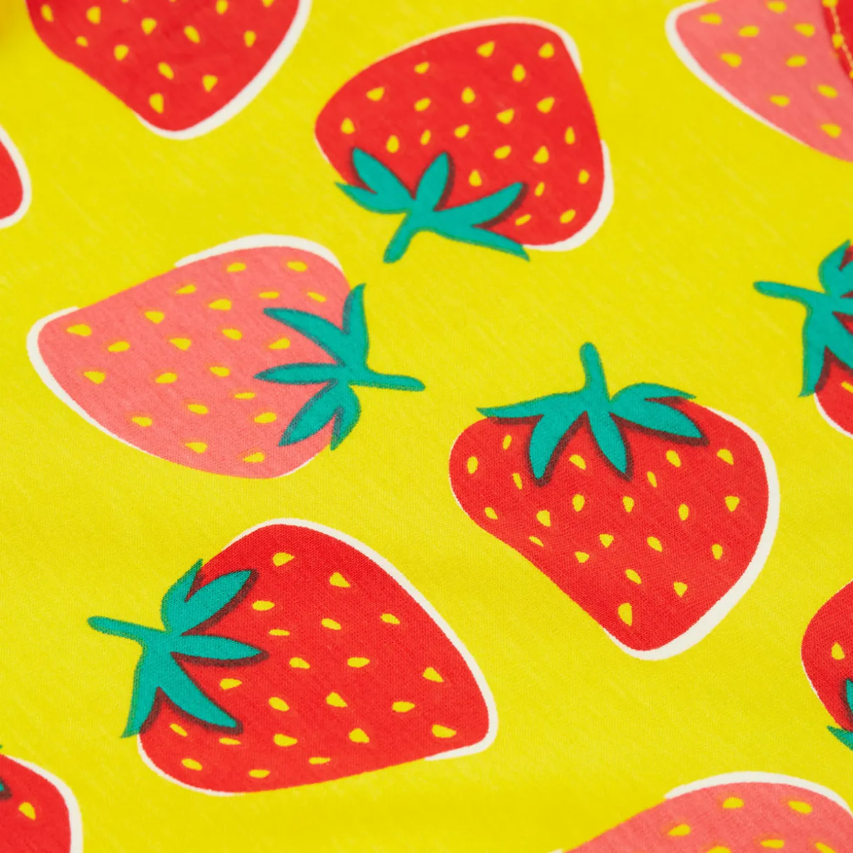 - Strawberry patch print, twirl-friendly full skirt, knitted, short sleeves, round neckline