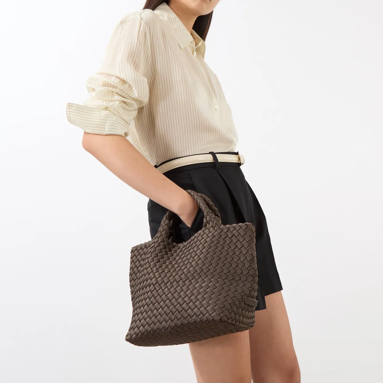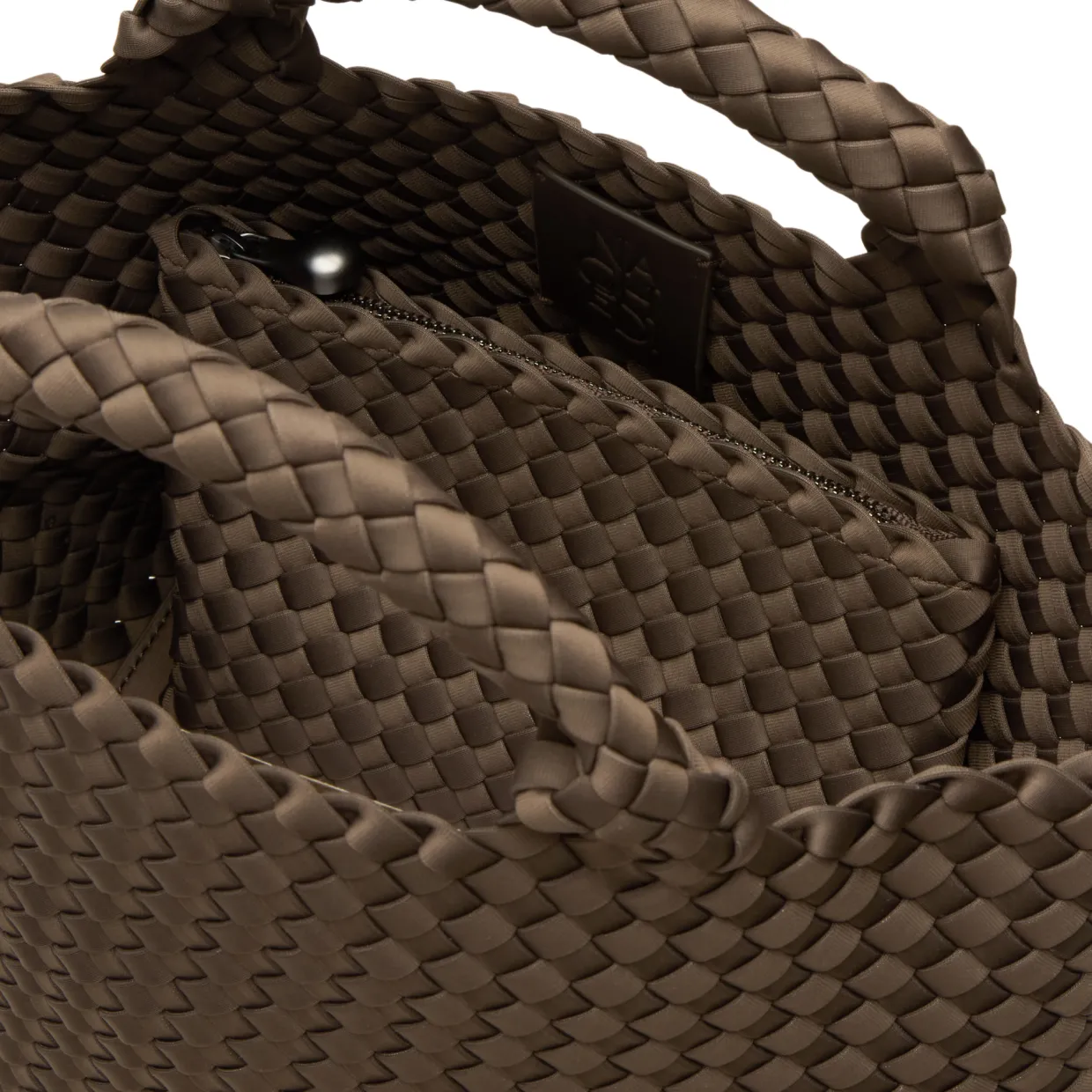 - Handwoven, two top carry handles, open top design, detachable and adjustable strap, side logo badge