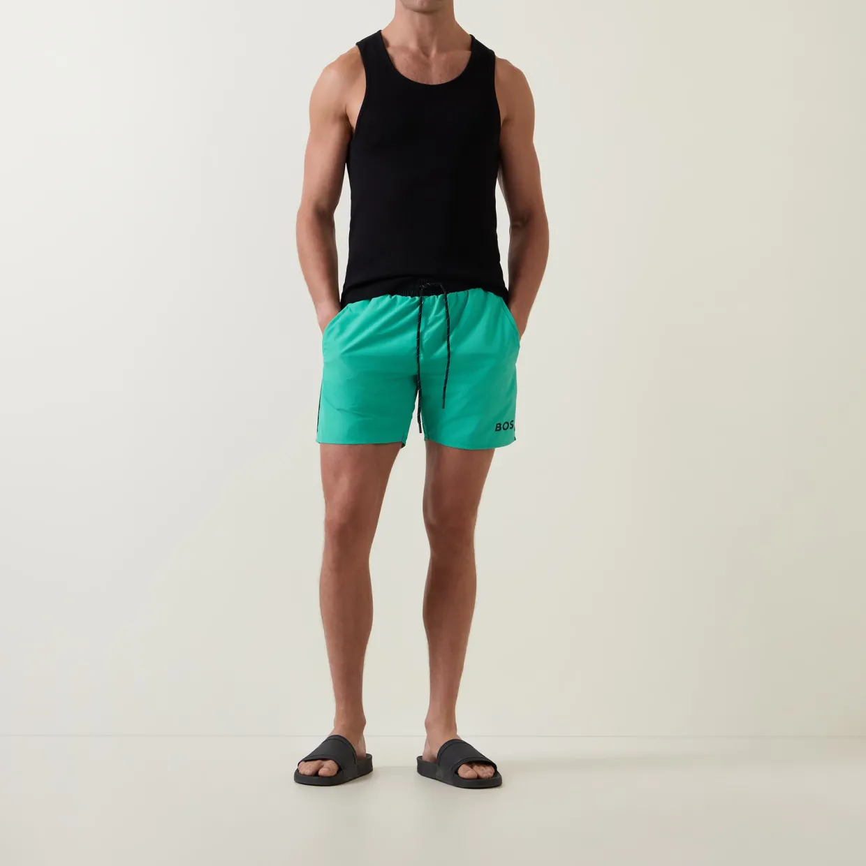 - Mid-rise, straight leg, elasticated waist, adjustable drawstring fastening, two side entry pockets, one rear welt pocket, contrasting stripe detail along each leg, clean hems, contrast logo detail