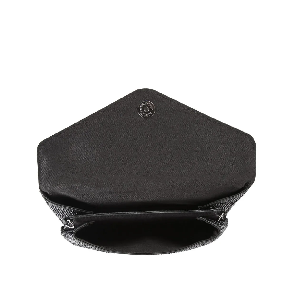 - Front flap with magnetic button fastening, chain strap, gold-tone logo plate, chunky chain detail with crystal embellishment, tonal stitching