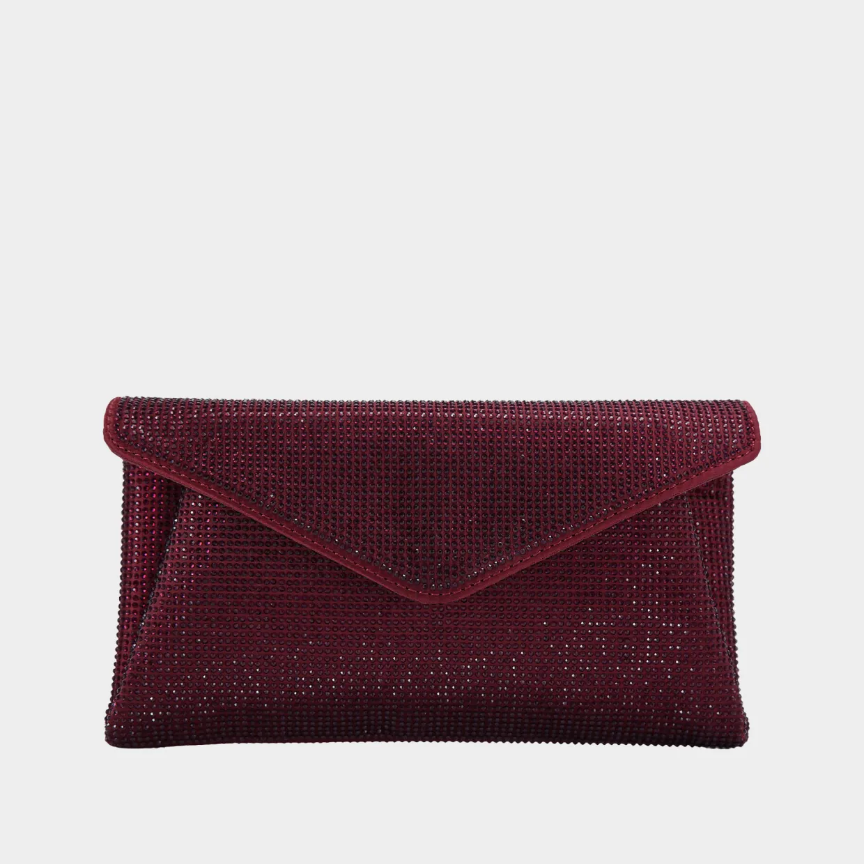 - Flap closure, envelope silhouette, rear logo branding, detachable chain strap, gold-tone hardware, satin finish, crystal embellished design