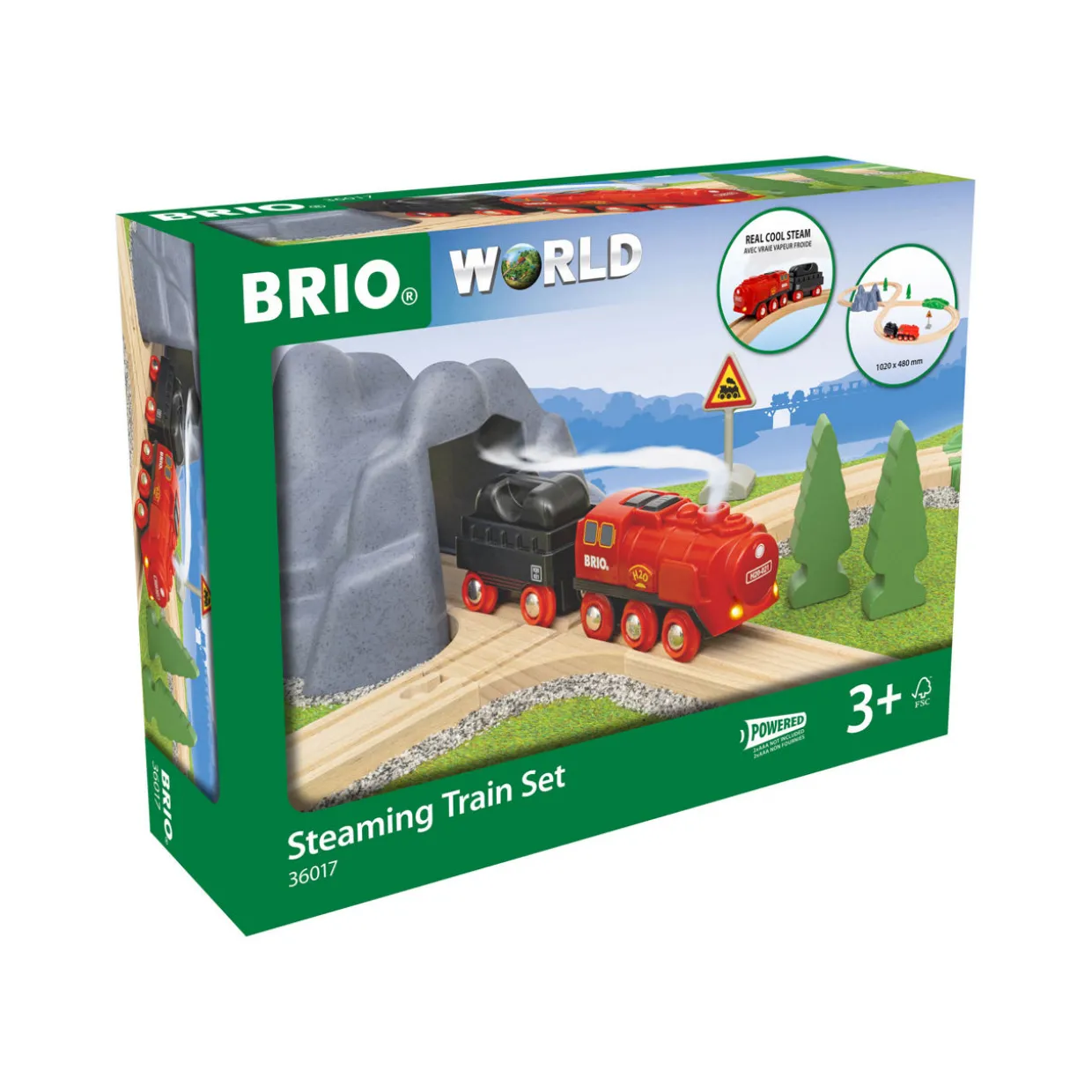- One battery-operated steaming train, one cargo wagon with refill load, one mountain tunnel, one mountain track, two wooden trees, one railway sign, fifteen wooden train tracks, one wooden railway crossing, safe-to-touch steam feature, lights