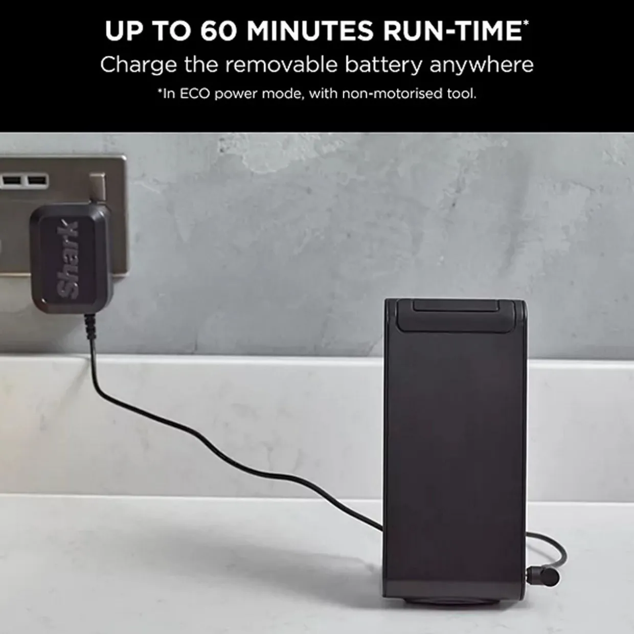 Enjoy up to 60 minutes of run-time. The removable battery pack can be charged on or off the vacuum, at any plug socket in your home. No need to be tied to a charging station. You can extend your run-time at any time by purchasing an additional battery pack from Shark
