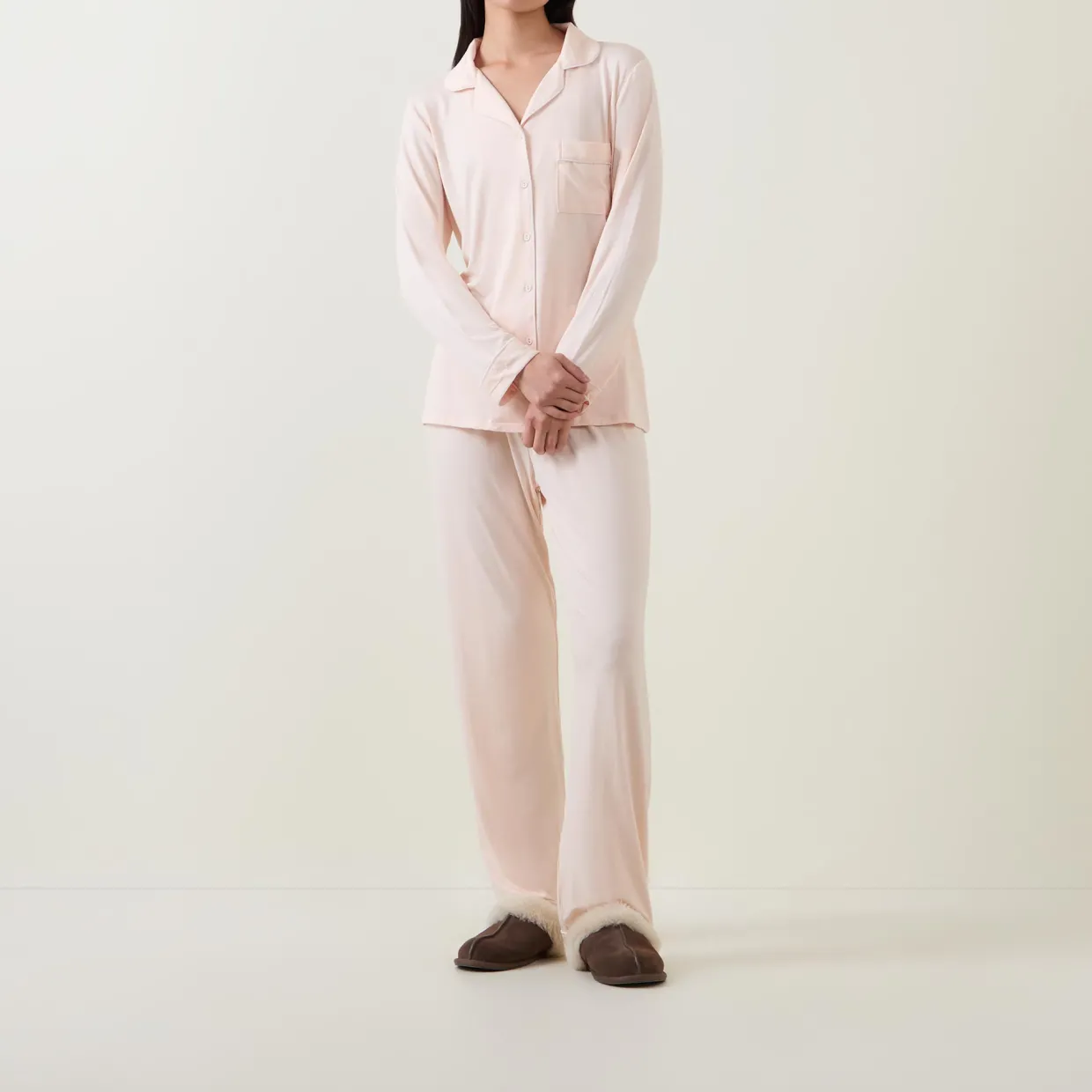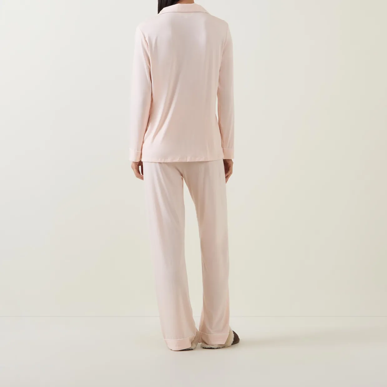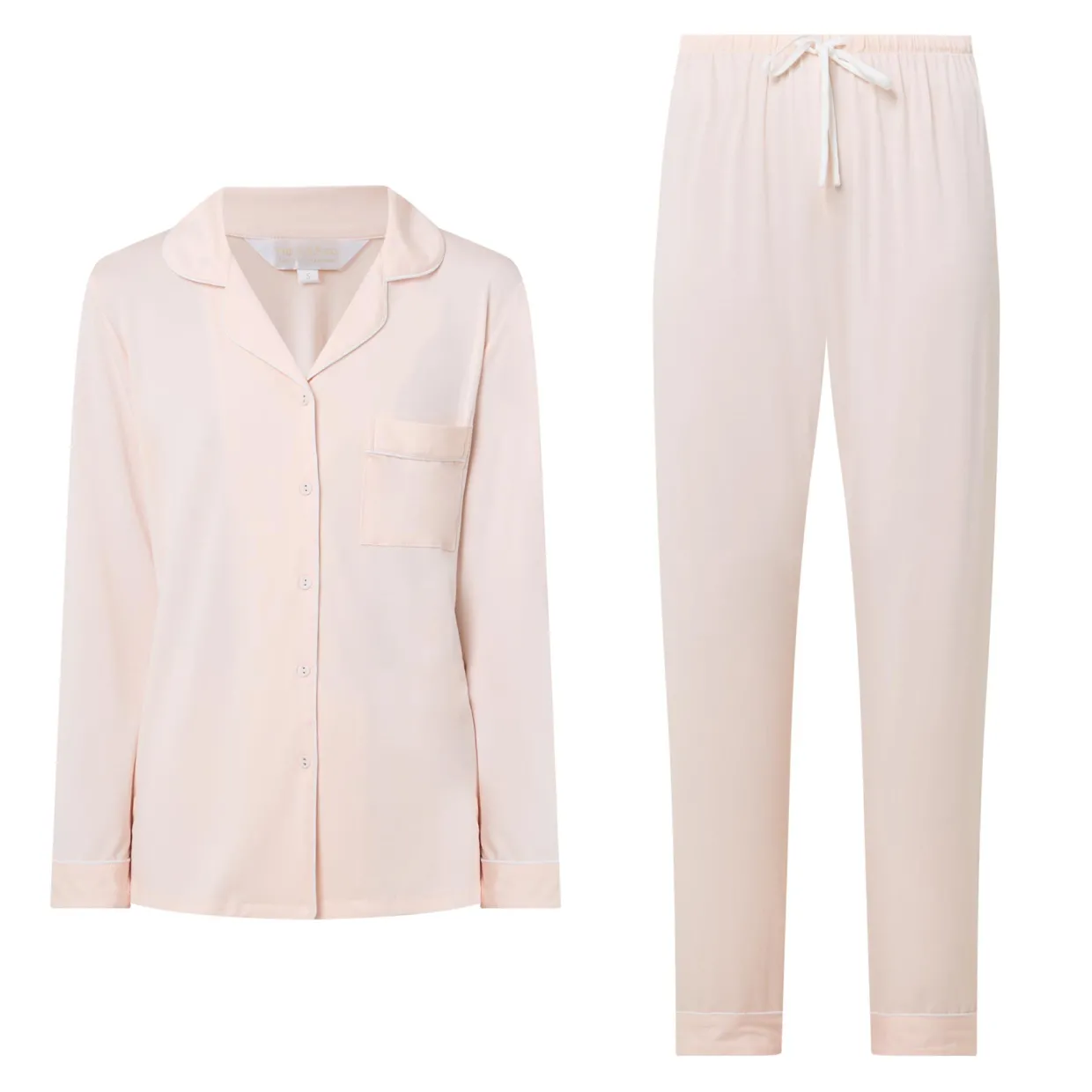 - Top: Notched lapels, button fastening, long sleeves, piped details, chest pocket. Bottoms: Full length, elasticated waistband with drawstring adjustable fit, piped details