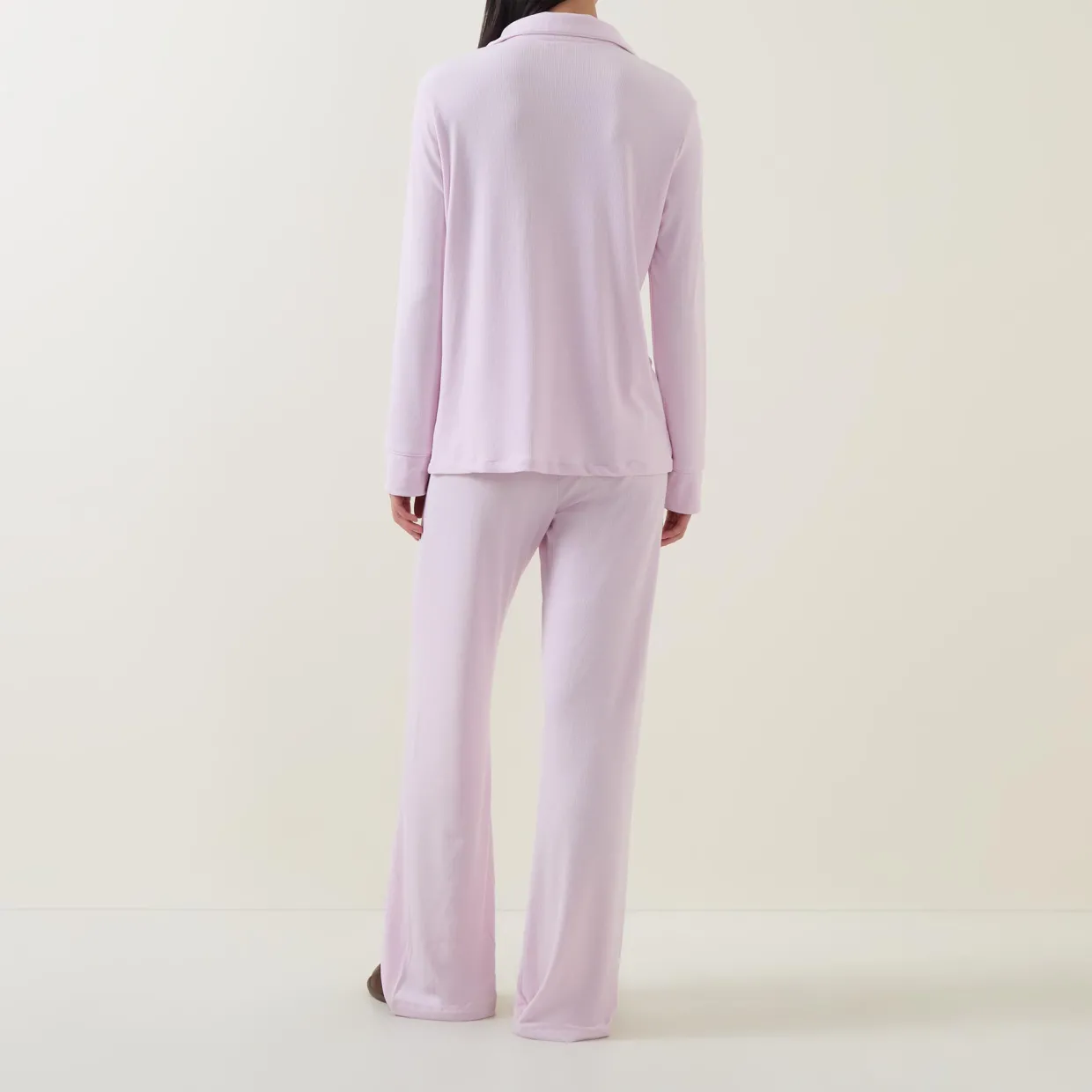 - Top: Notched lapels, long sleeves, straight hemline, button fastening, stretch ribbed fabric, chest pocket. Bottoms: Elasticated waist with drawstring adjustable fit, stretch ribbed fabric