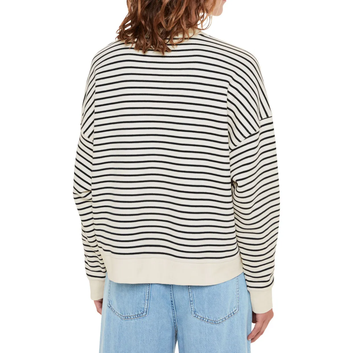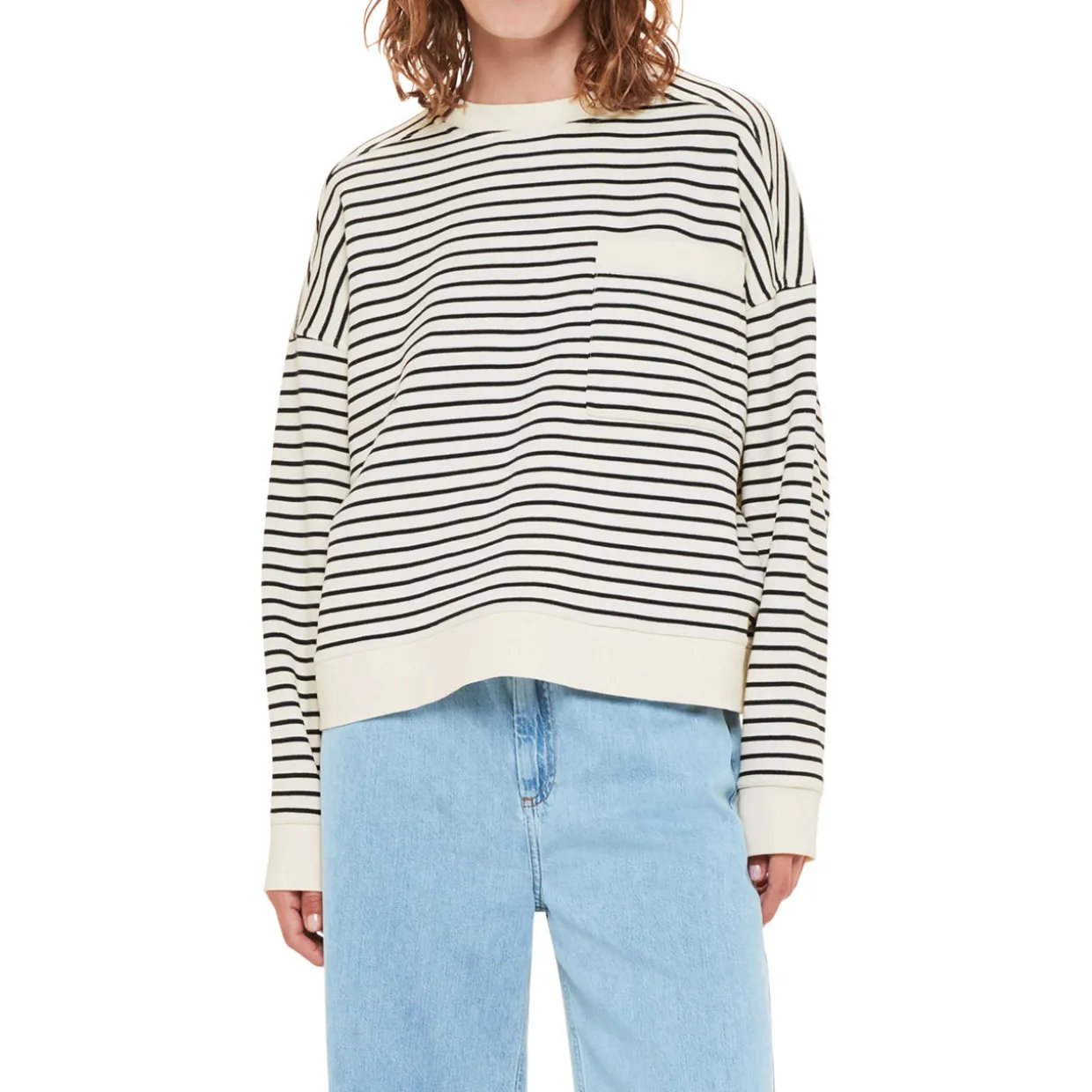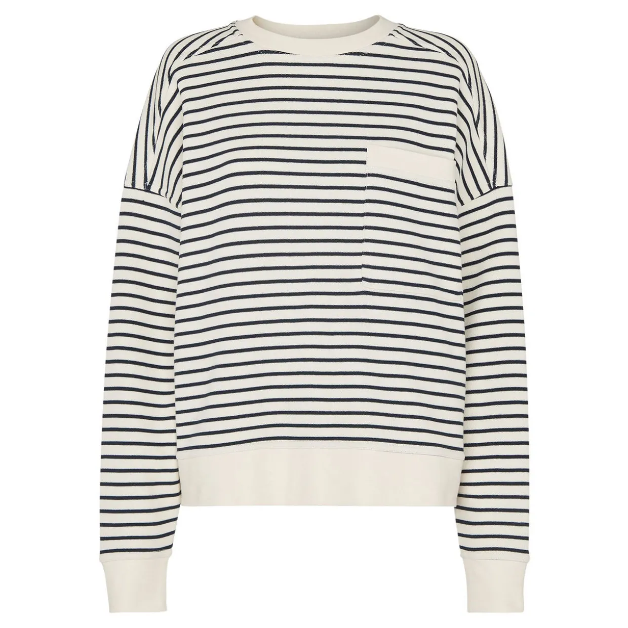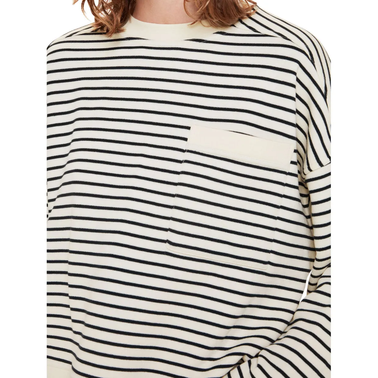 - Round neckline, ribbed trims, long sleeves, straight hemline, stripe pattern, chest patch pocket