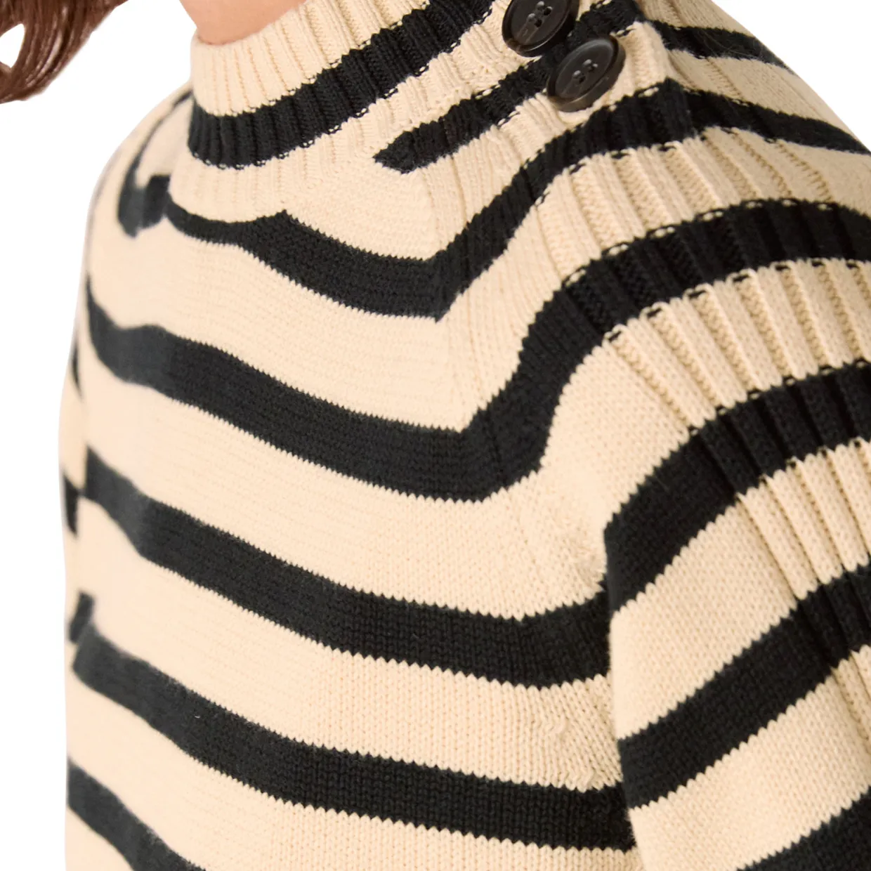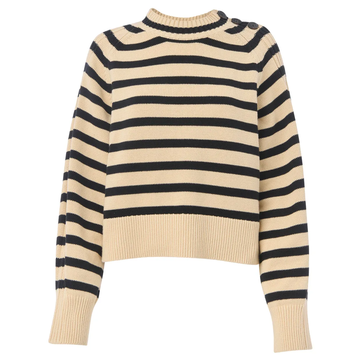 - Horizontal stripes, round neckline, long sleeves, single colour cuffs