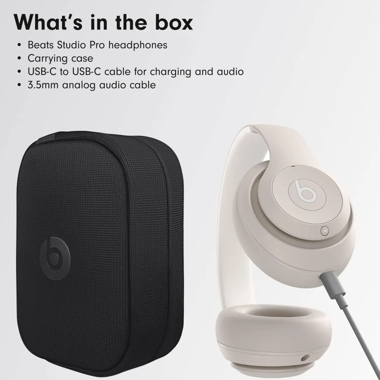 WHAT’S IN THE BOX: Beats Studio Pro Wireless headphones, Woven carrying case, 3.5mm audio cable, Universal USB-C charging cable, Quick Start Guide, Warranty Card