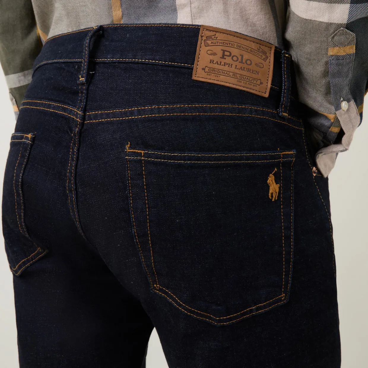 - Mid-rise, slim-leg, belt loops, concealed fly and button fastening, five-pocket styling, clean hems, contrast stitch detailing, rear logo patch