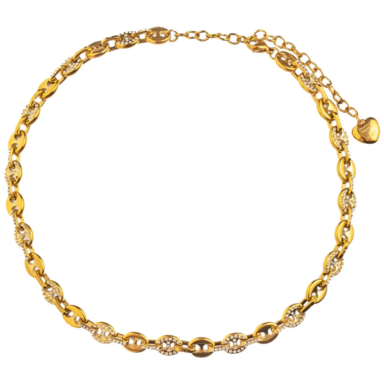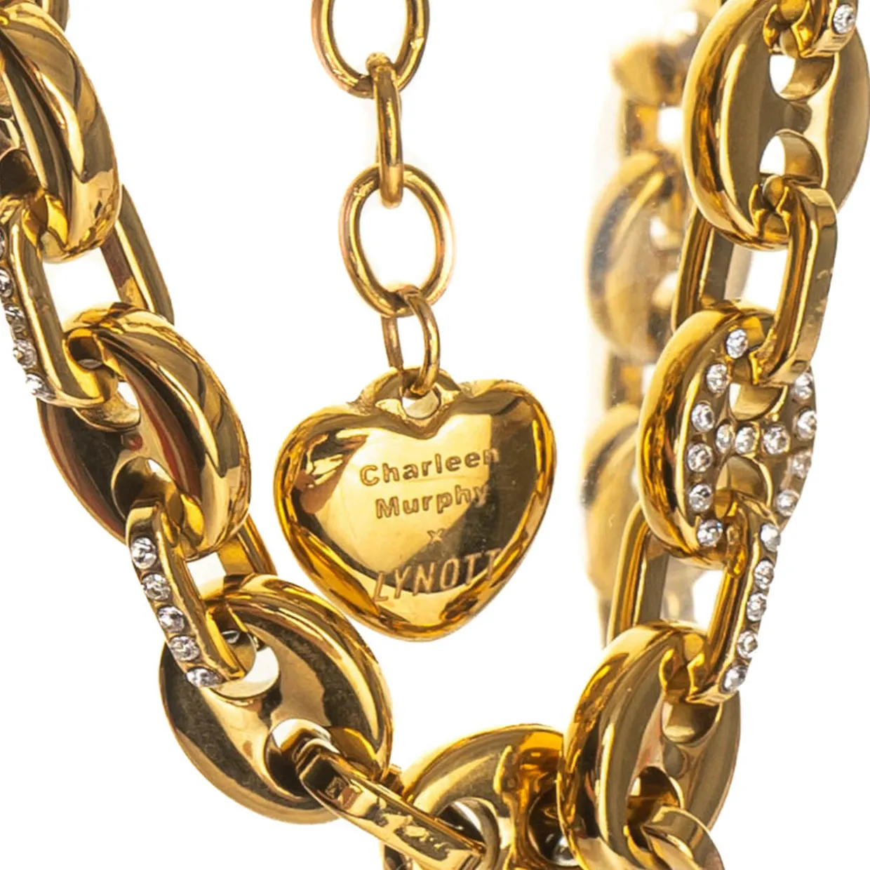 - Choker style necklace, chunky rolo links, stone embellishment, lobster clasp closure, heart-shaped logo plate, tarnish resistant and water resistant, adjustable length, gold-plated, presented in a branded gift box