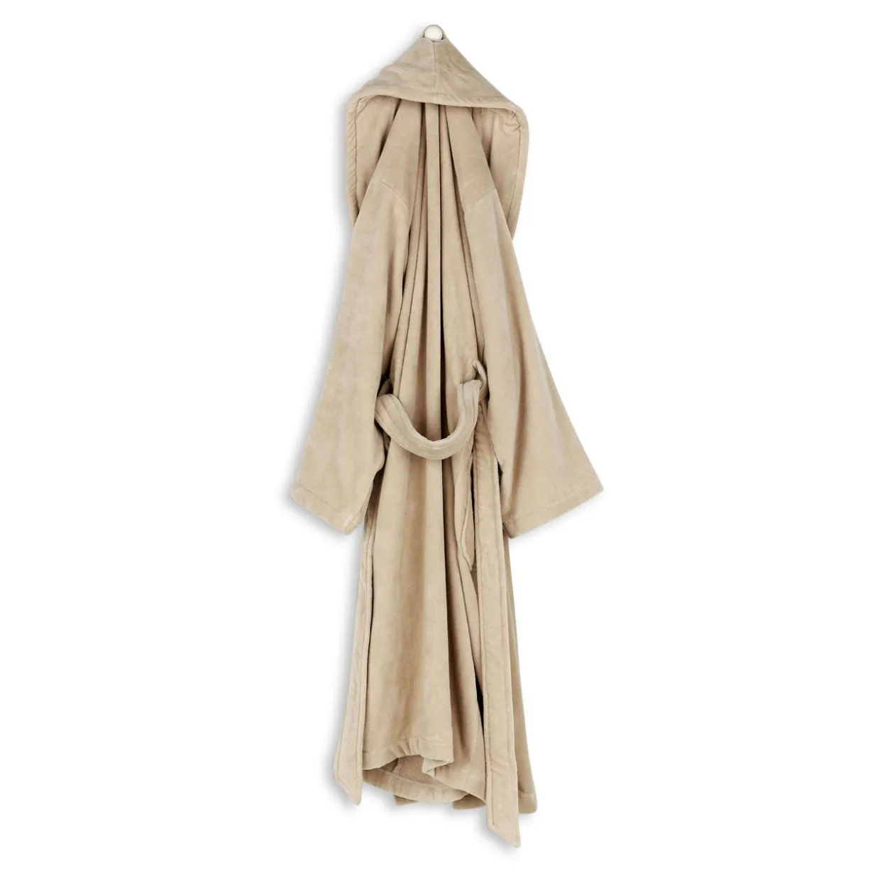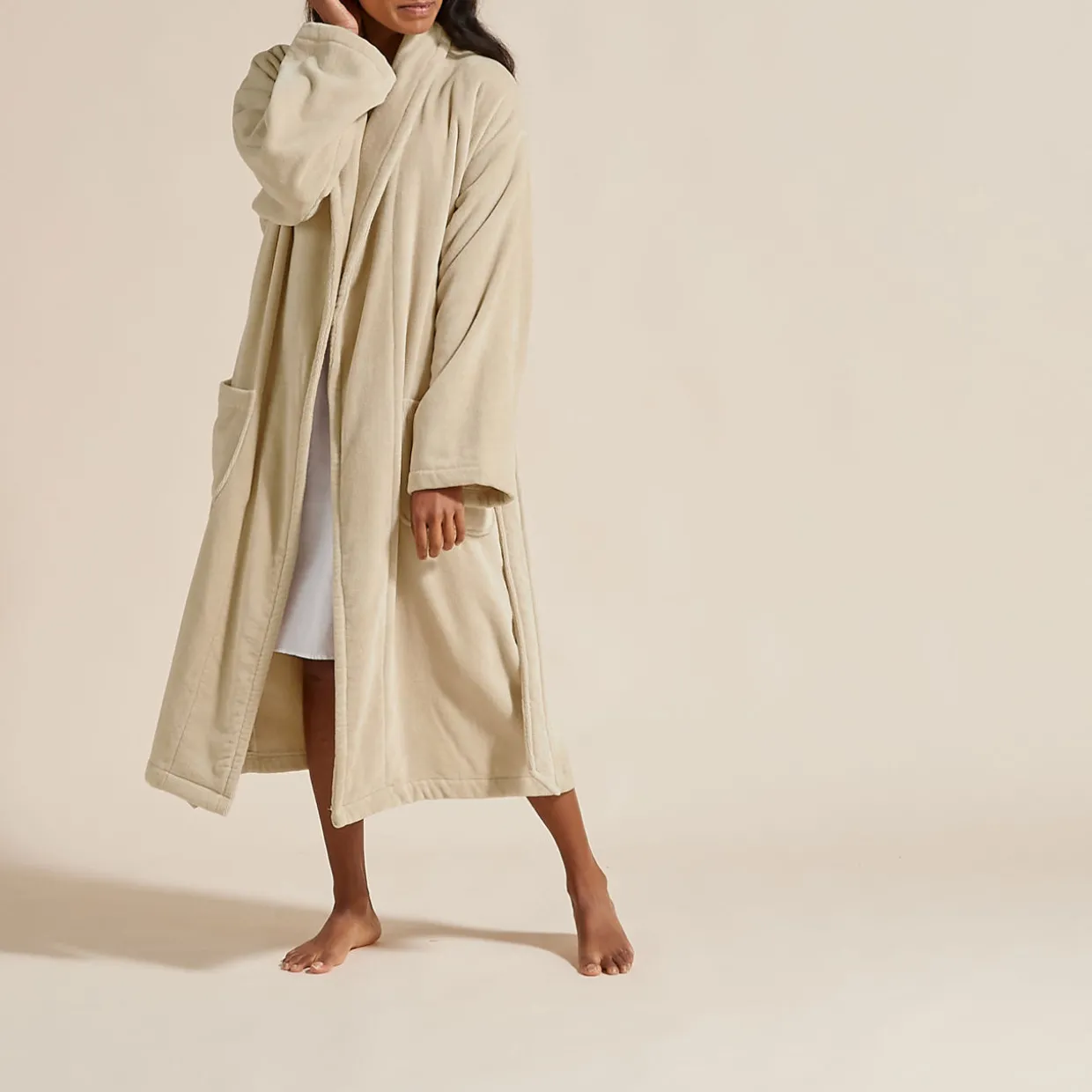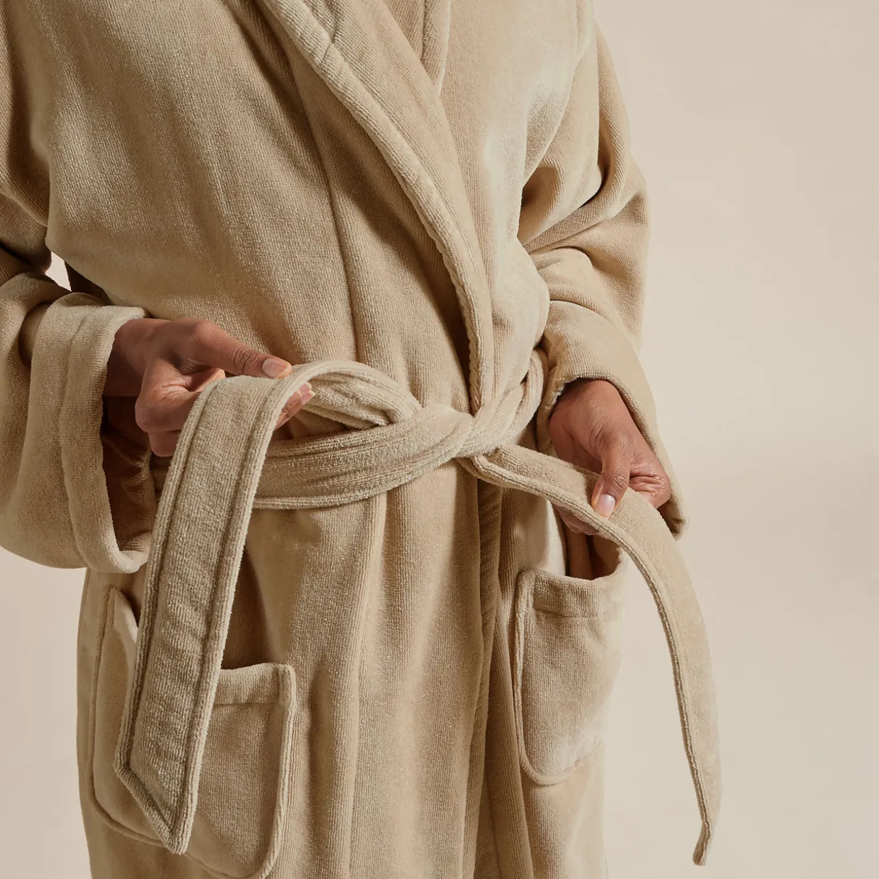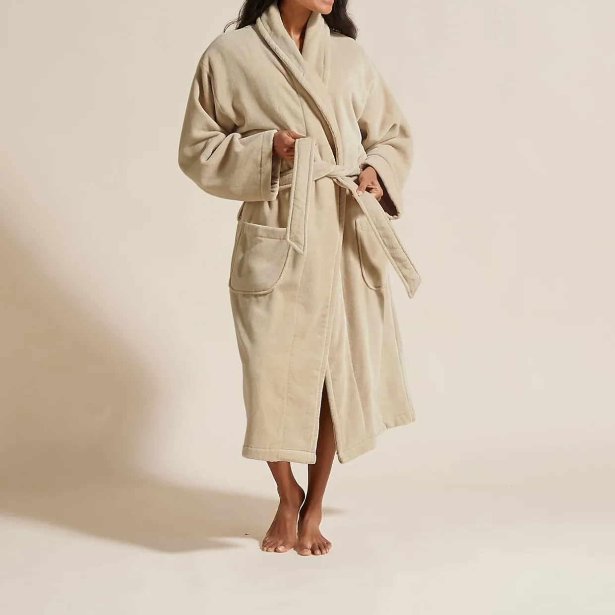 - Soft cotton construction, velour finish, front patch pockets, shawl collar, long sleeves, self-tie belt