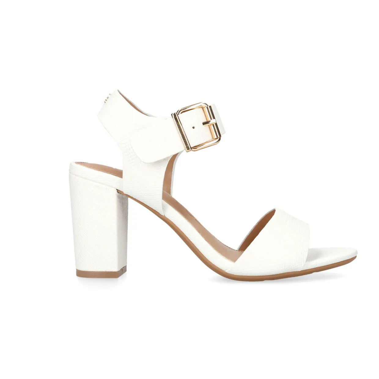 - Almond-shape open toe, wide toe strap, ankle strap with buckle fastening, adjustable fit, block heel, smooth finish