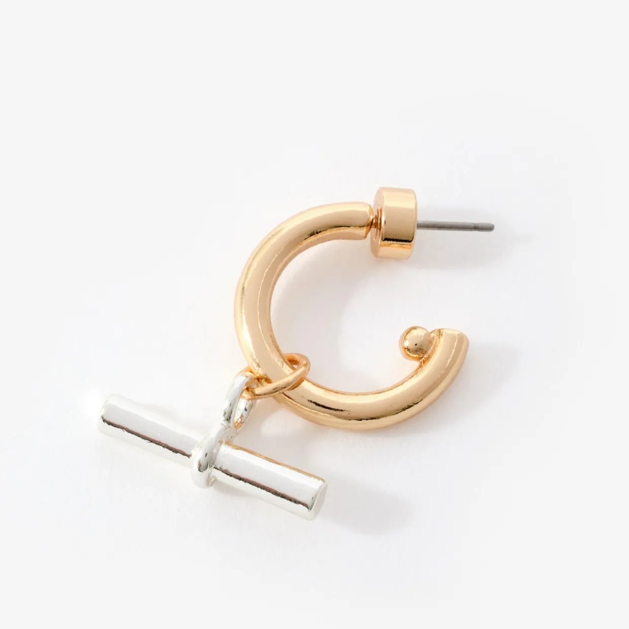 - Mixed metal, hoop style, hanging T-bar charm, clasp fastening