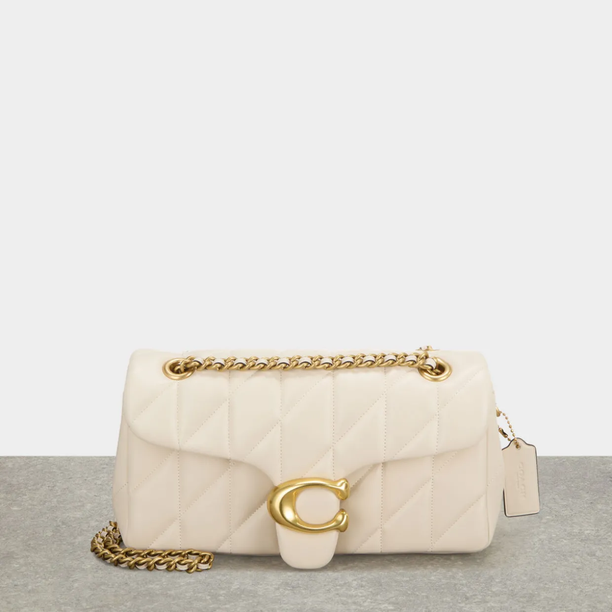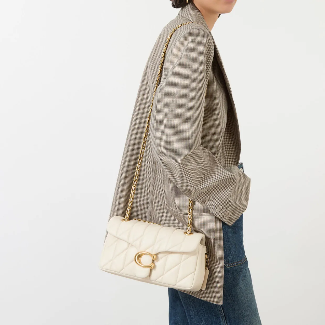 - Braided shoulder strap, quilted, flap closure, logo detail, hanging charm, rear slip pocket, metal hardware, interior zipped pocket