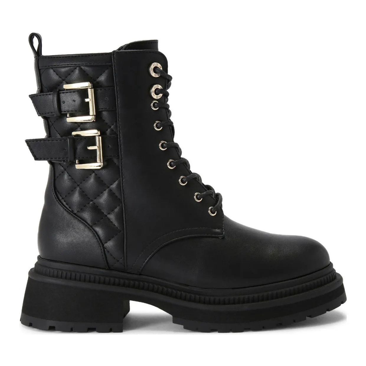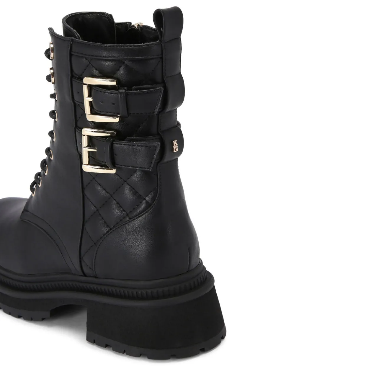 - Lace-up fastening, ankle length, quilted panel at the ankle, gold-tone buckle embellishment, round toe, chunky tread sole