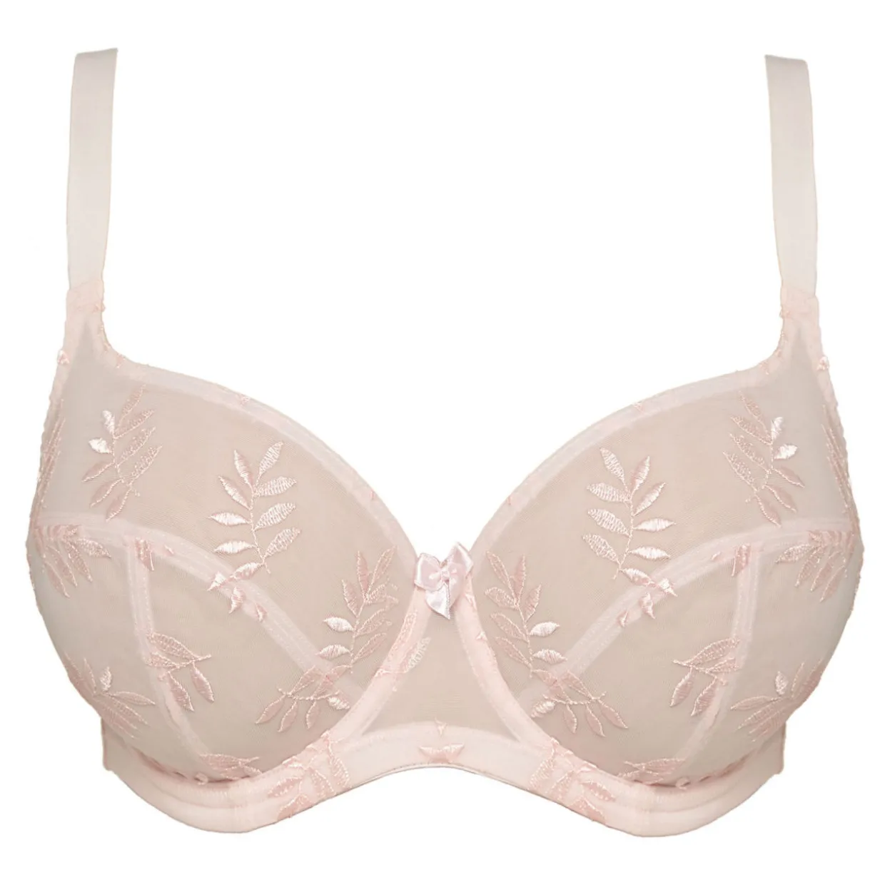 - Multi-part underwire cup, leaf embroidery, centre bow embellishment, adjustable straps, hook and eye fastening.