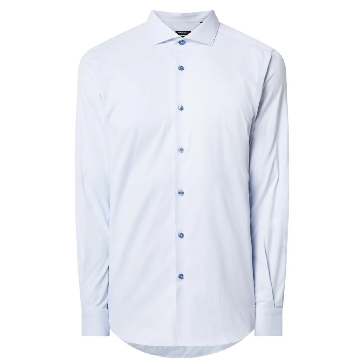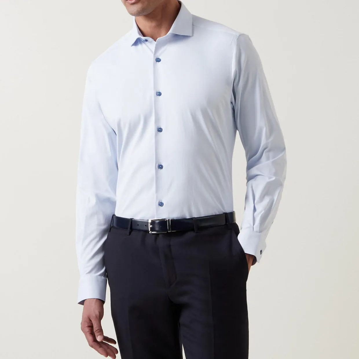 - Long sleeves, pointed collar, tapered fit, button-down front, contrast inner tape.