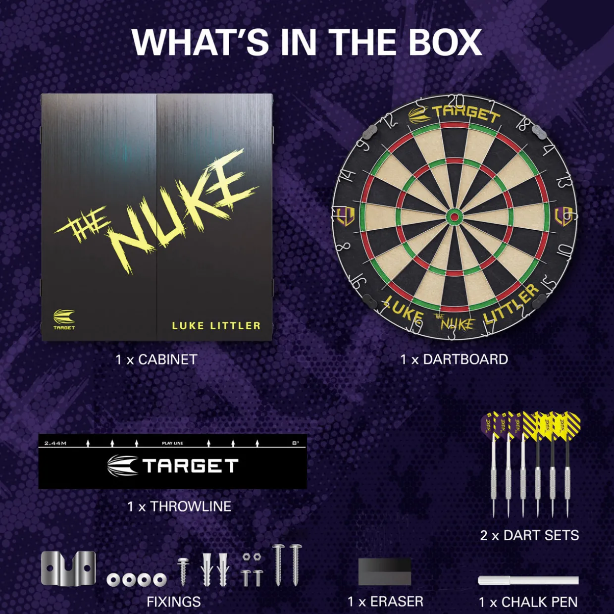 - Luke ‘The Nuke’ Littler competition standard dartboard, two sets of steel tip darts, one throwline, one wall mounting kit