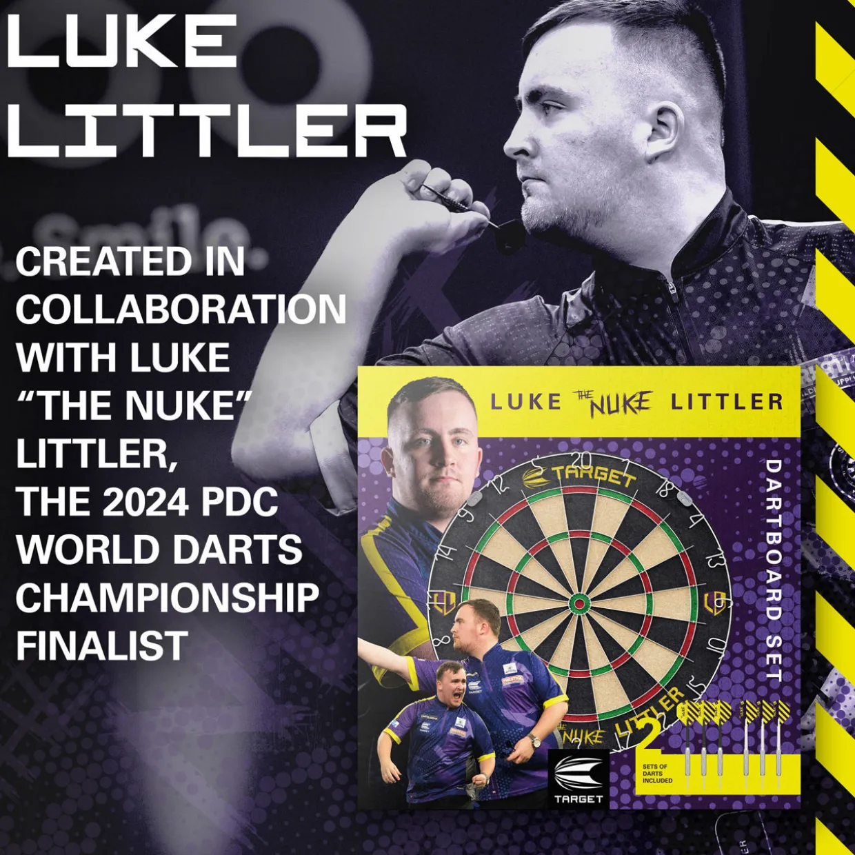 - Luke ‘The Nuke’ Littler competition standard dartboard, two sets of steel tip darts, one throwline, one wall mounting kit