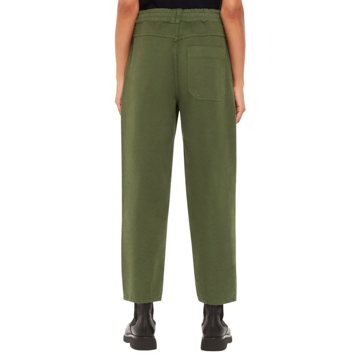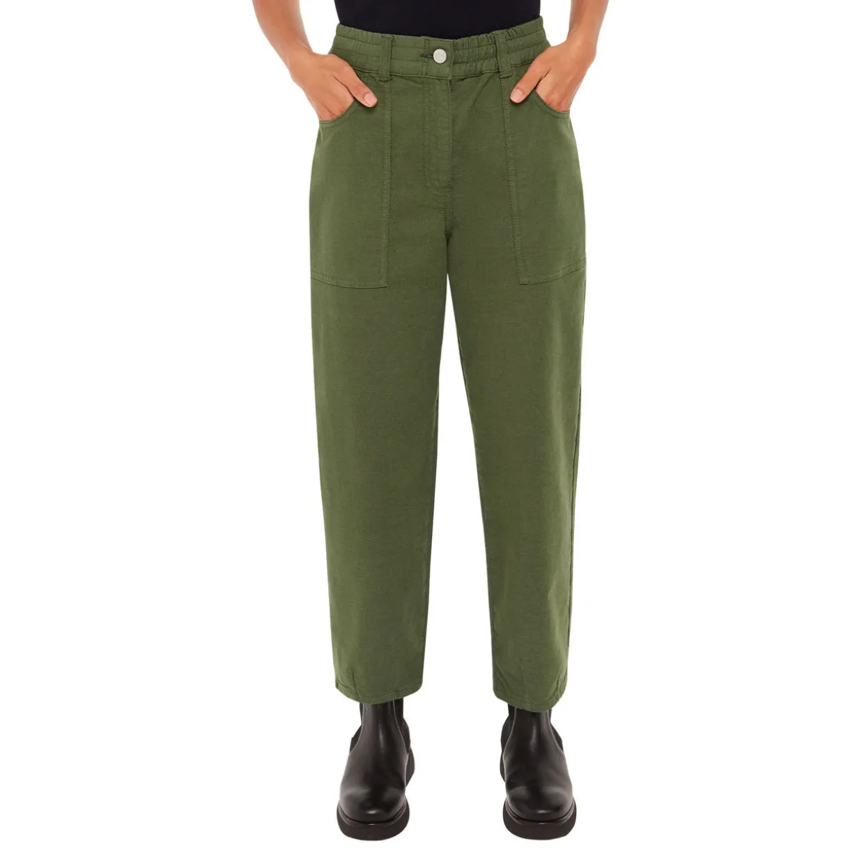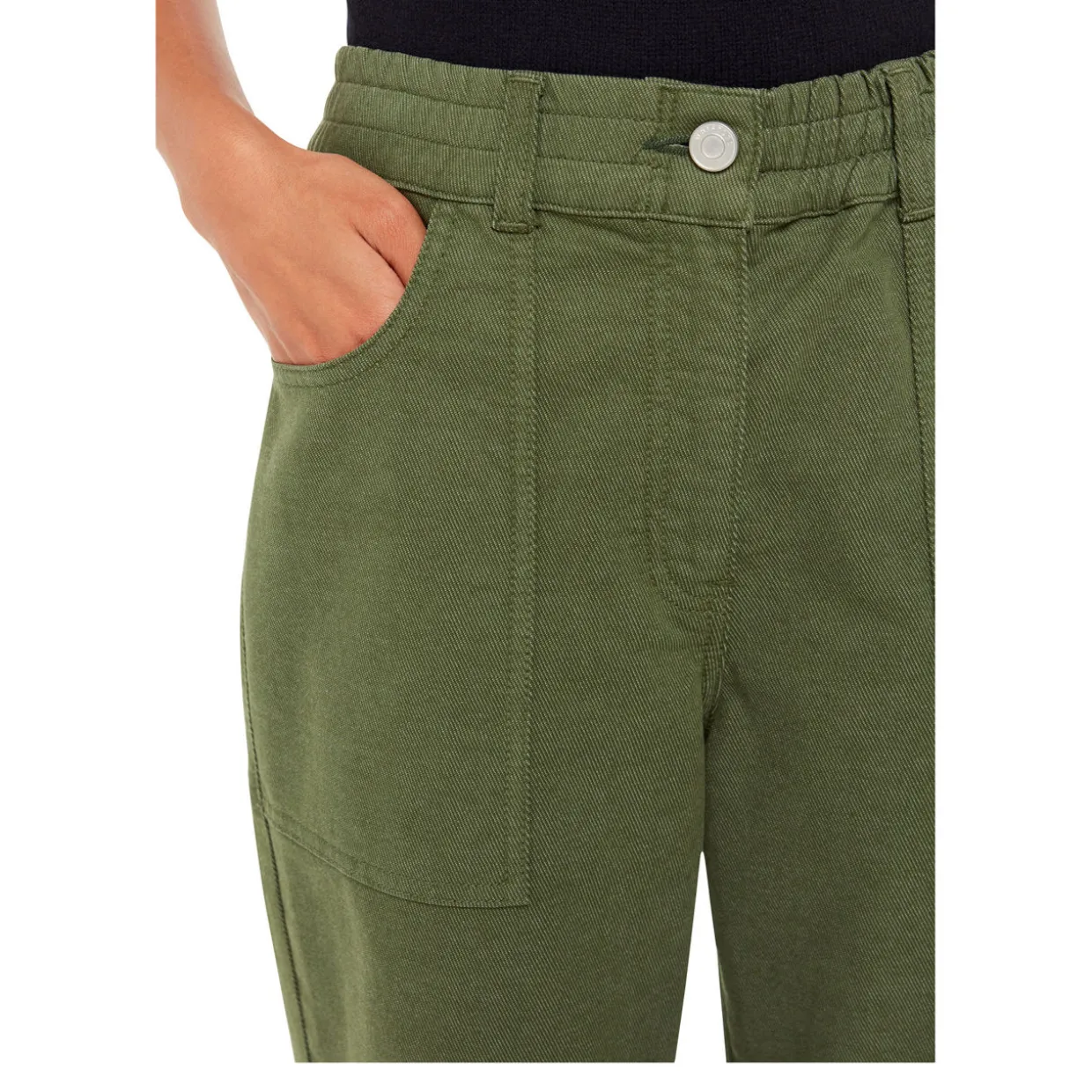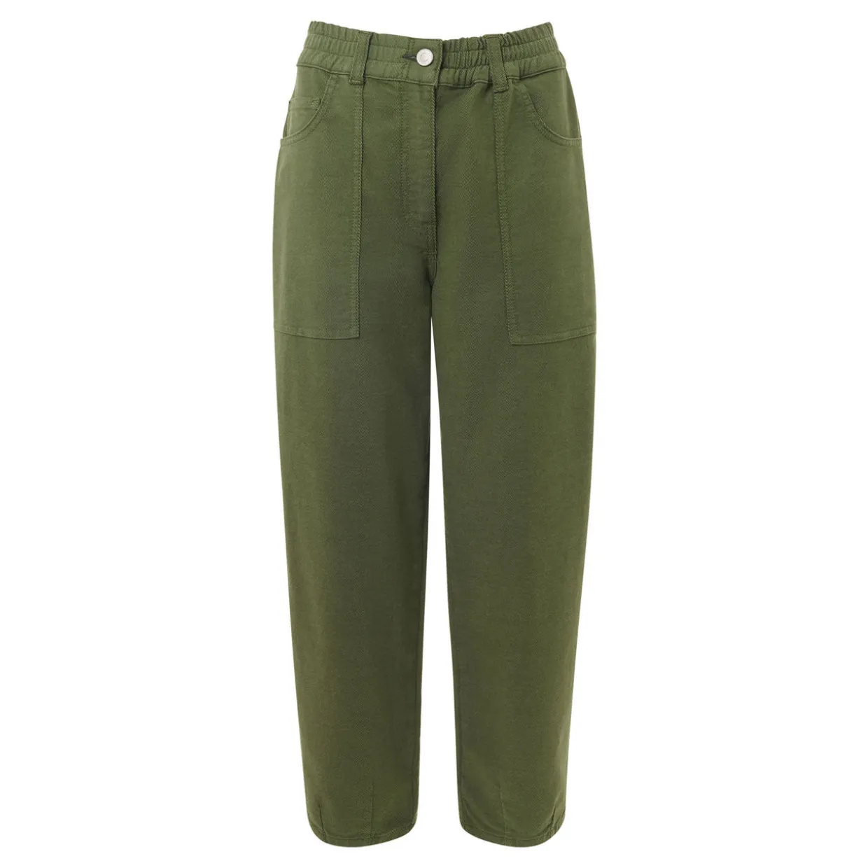 - Elasticated waistband, zip-fly and button closure, four-pocket design, tonal stitching, smooth fabric