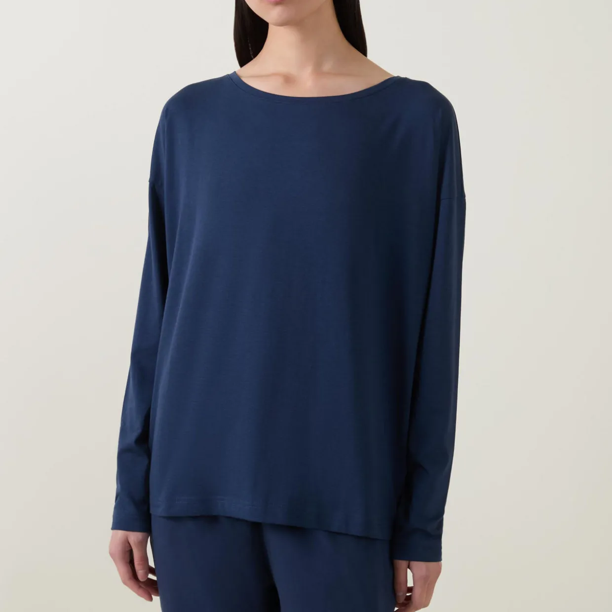 - Boat neckline, long sleeves, fitted cuffs, straight hemline, solid style
