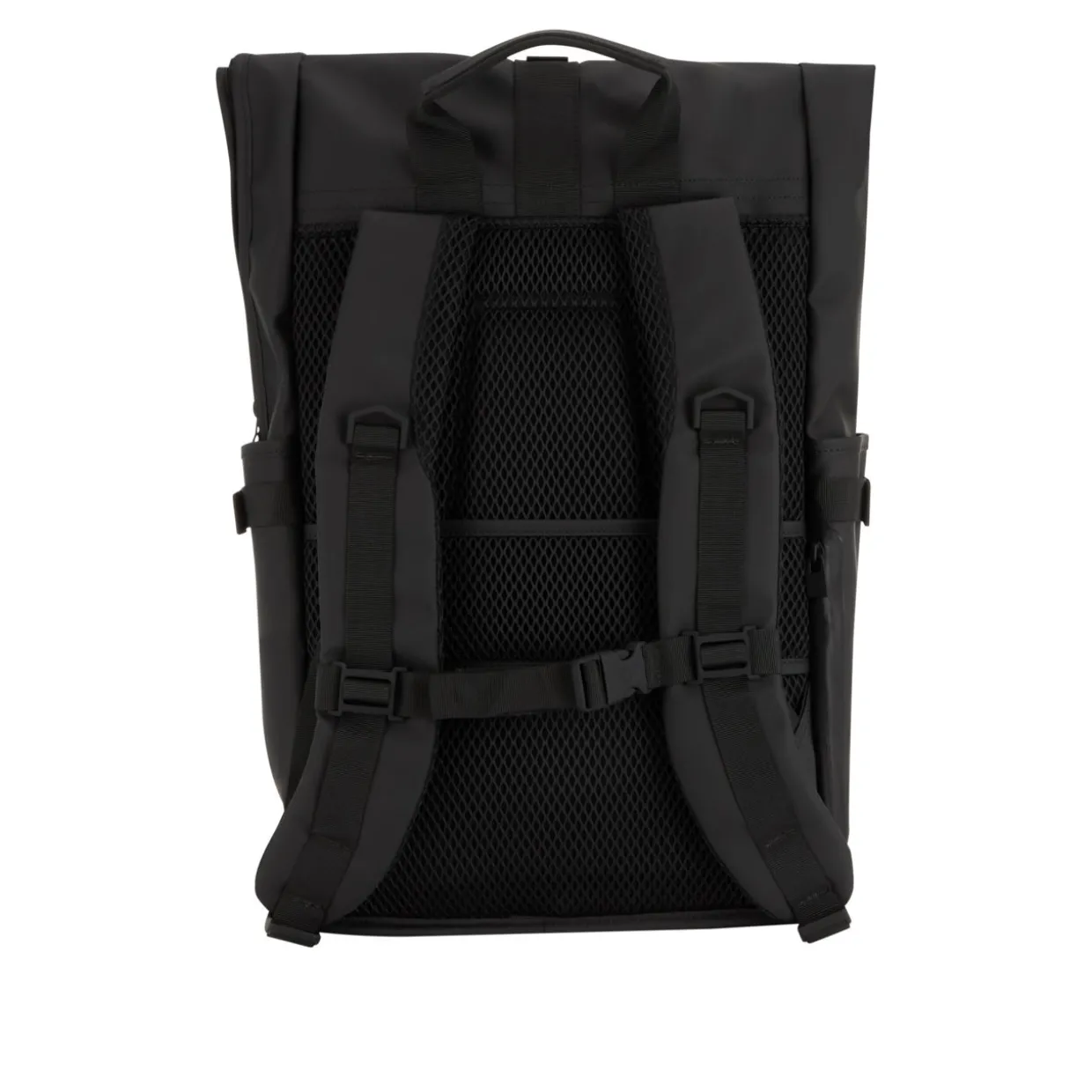 - Folded top with zip and buckle fastening, extra wide opening, moulded front pocket, waterproof, interior keyloop with snap hook, compression straps, padded adjustable backstraps, top carry handle, padded mesh back panel, logo details, durable finish