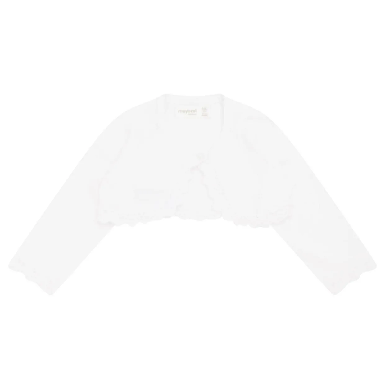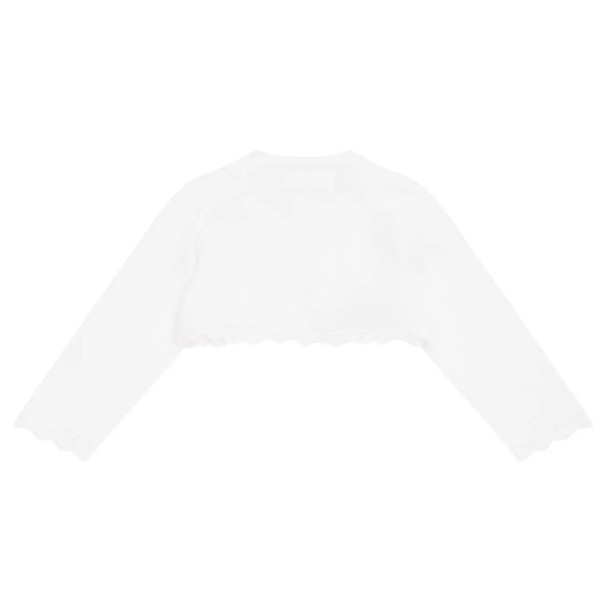 - Round neck, single button fastening, long sleeves, scallop trim edges with textured detailing, cropped length, knit construction