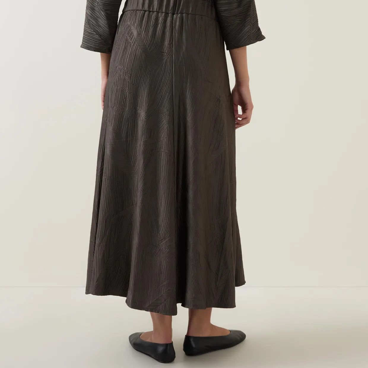 - Mid-rise, elasticated waistband, flared design, textured pattern, midi length