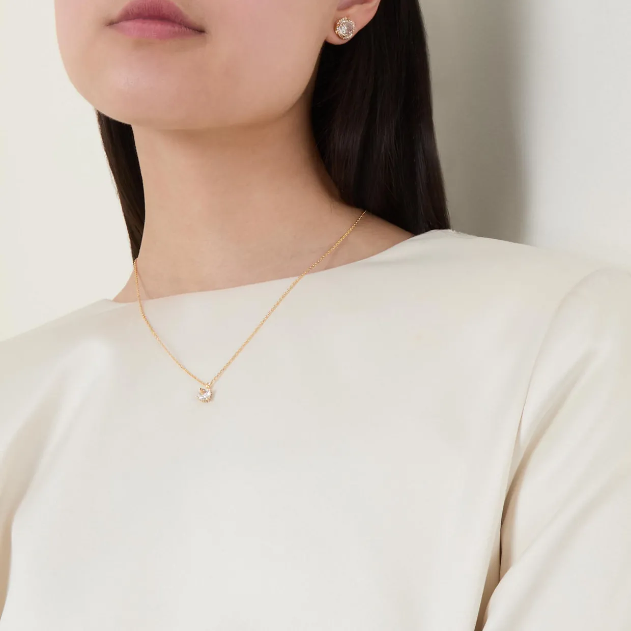 - Circular design, cubic zirconia stone detailing, post and signature spade clutch fastenings, engraved logo detailing, gold-tone finish