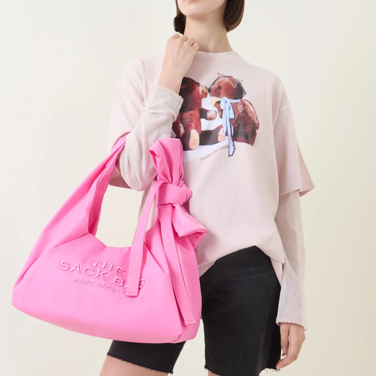 - Bow detail, top handle, magnetic closure, logo detail, internal zipped pocket