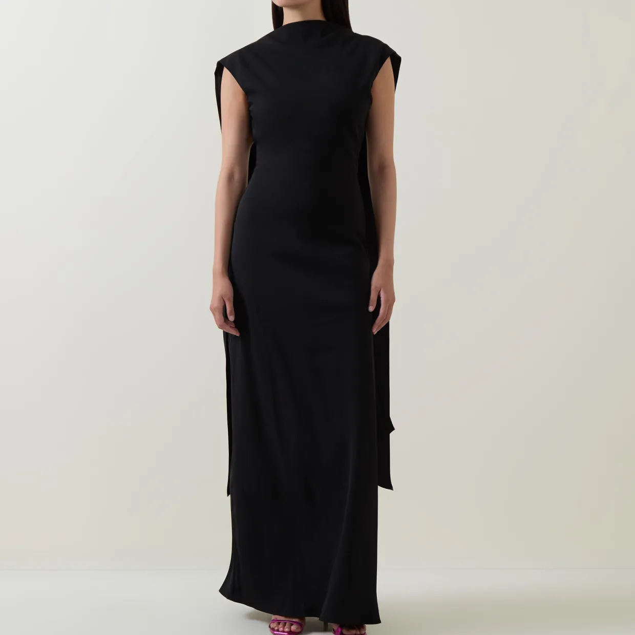 - High cowl neckline, draped details at shoulders, low scoop back, discreet side zip fastening, no stretch fabric, sleeveless, maxi length