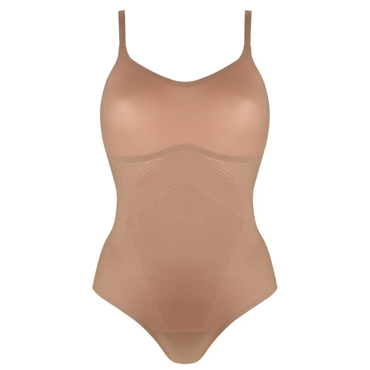 - Gentle V-neckline, adjustable straps, breathable and lightweight fabric for total comfort, non-compressive bust, bonded edges for a smooth transition to skin and no digging, quick-dry, Printed Power®, made with Lycra® FitSense™, offers lightweight targeted tummy shaping and wraps around for added side support, thong back, full coverage front
