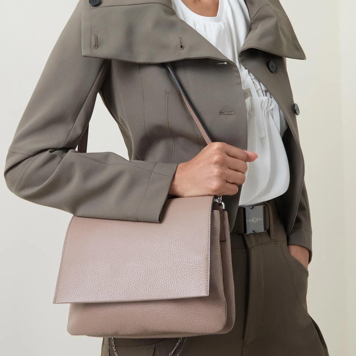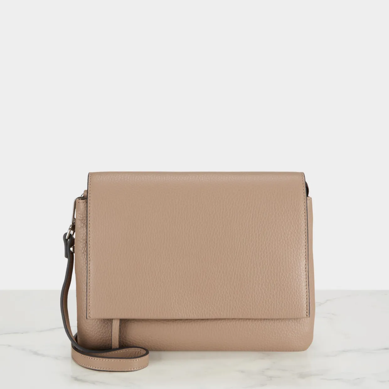 - Flap fastening with magnetic button and zip closure, split main compartment, silver-tone hardware, grained finish, logo details, crossbody strap