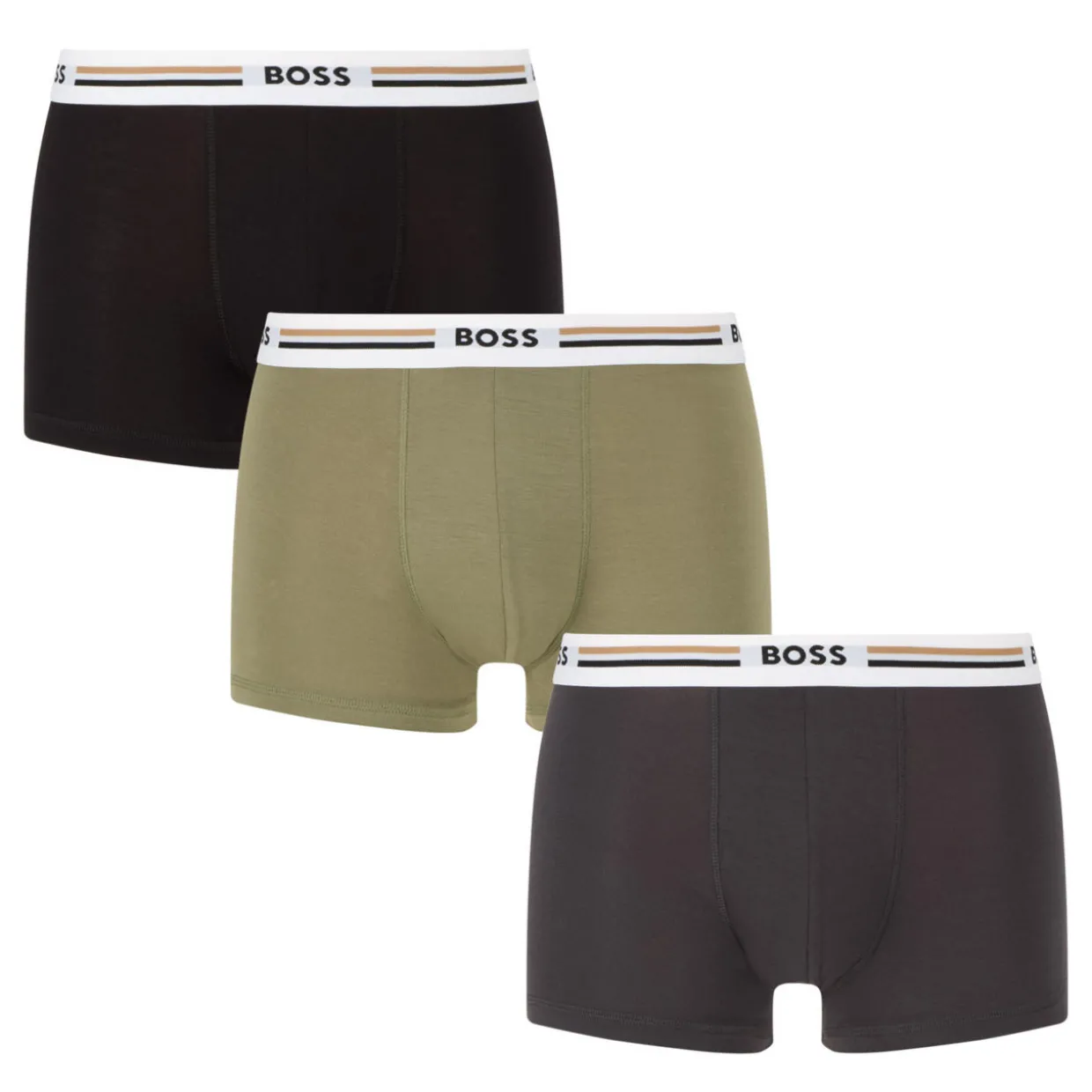 - Three-pack, elasticated waistband with logo branding and logo stripe detailing, assorted colours, tonal stitching, boxer style, smooth seamless fabric
