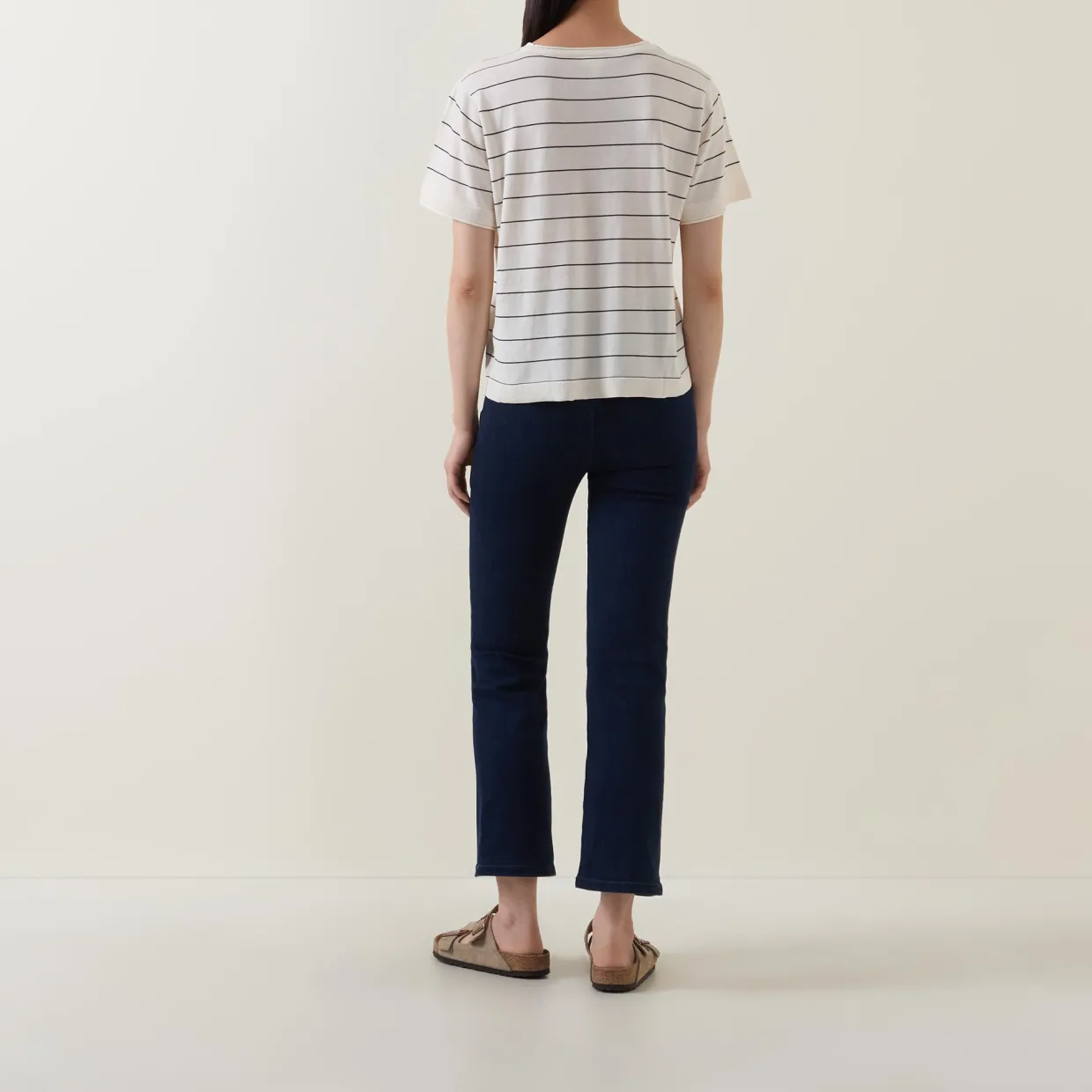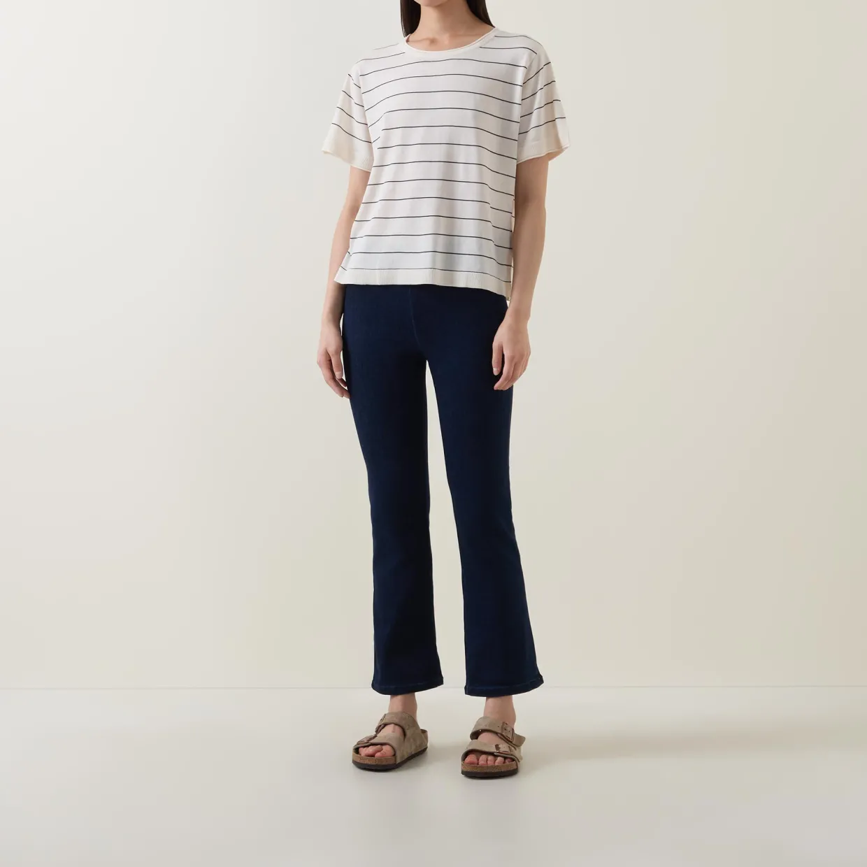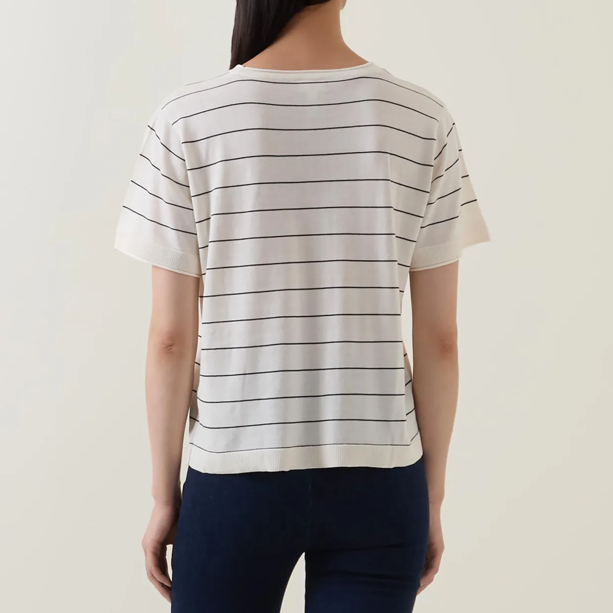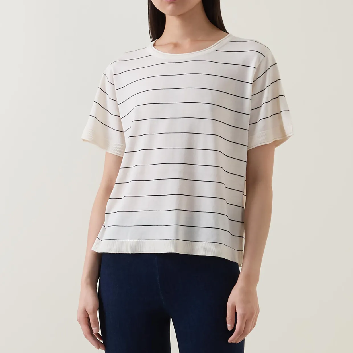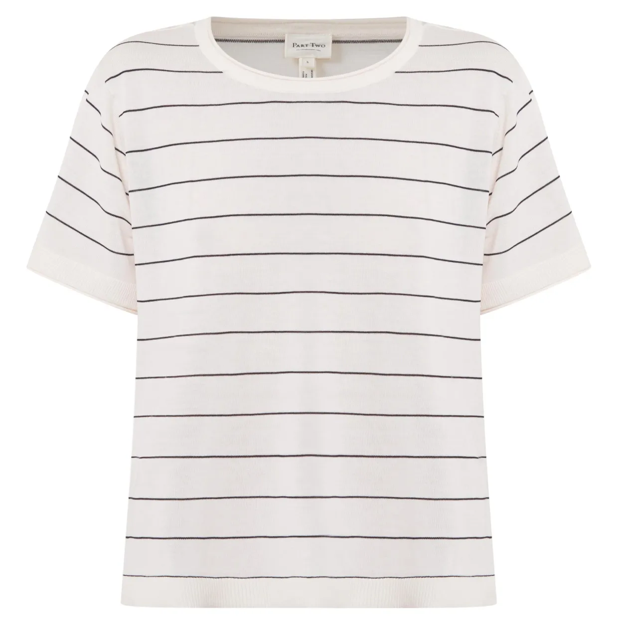 - Round neck, short sleeves, striped, straight hemline