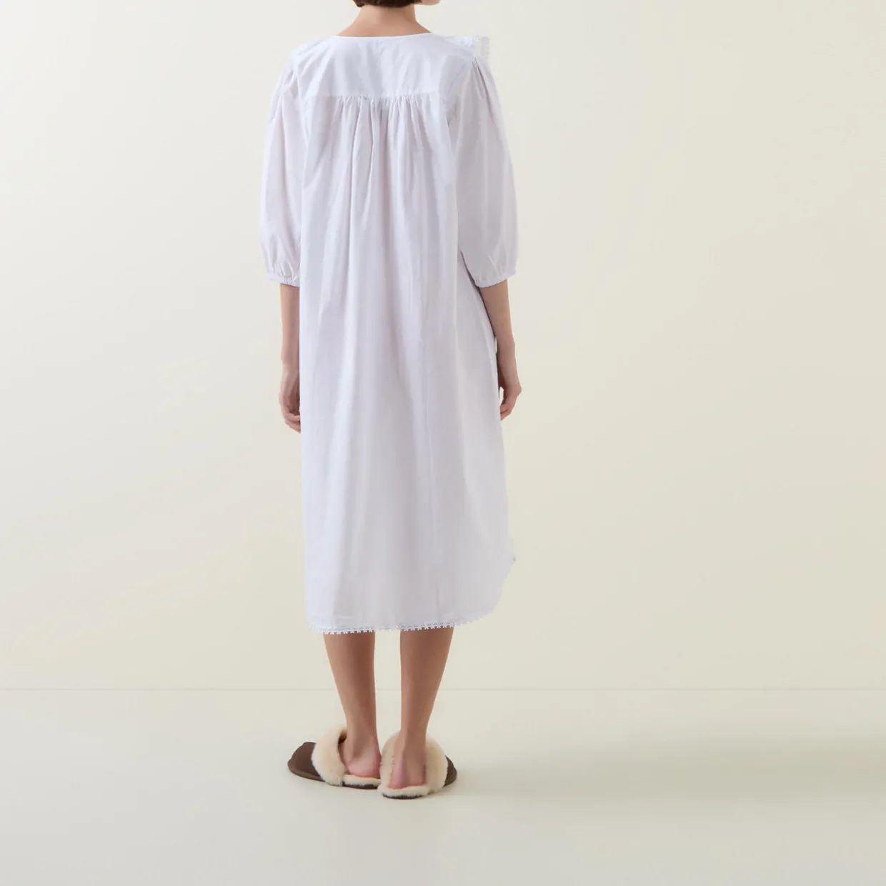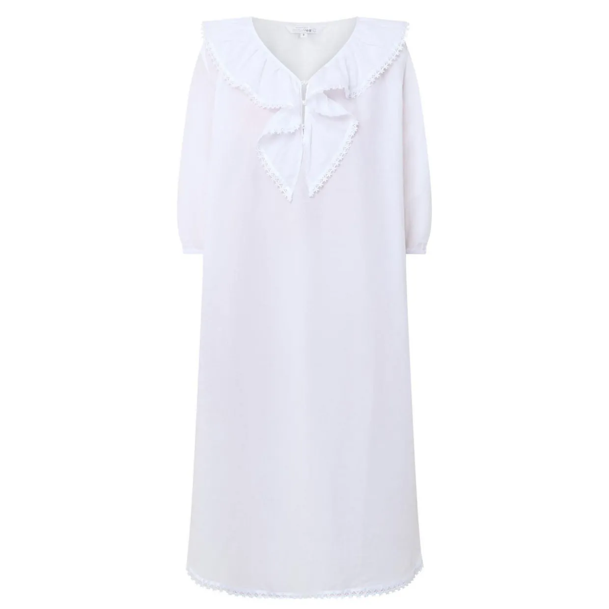 - V-neckline, three-button placket, ruffle-trim collar, half-length sleeves, elasticated cuffs, rear gathered detailing, curved hem, guipure lace detailing throughout, lightweight, mid length