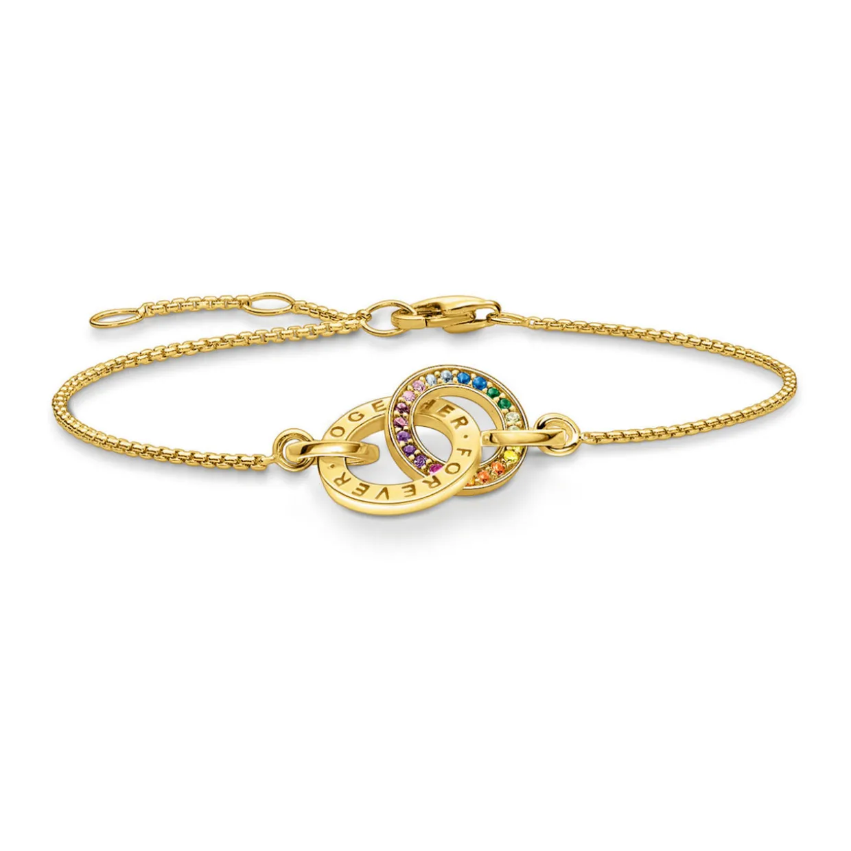 - Venetian chain link, lobster clasp fastening, adjustable fit, interlocking rings, rainbow hued stone detailing, gold-plated, engraved logo details