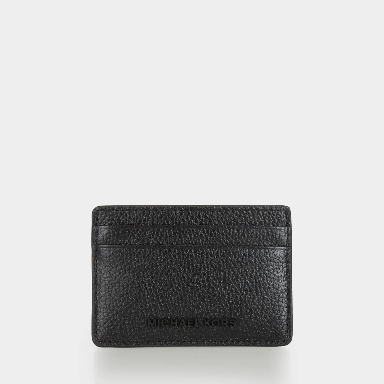 - Four card slots, one slip pocket, tonal logo hardware, pebbled leather finish