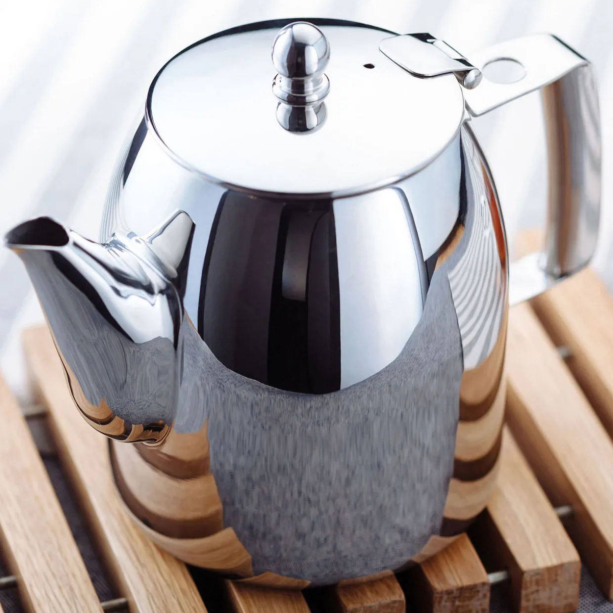- Smooth stainless steel, teabag retaining clip, dribble free pouring spout, argon welded spout, eight-cup (1.5L) capacity